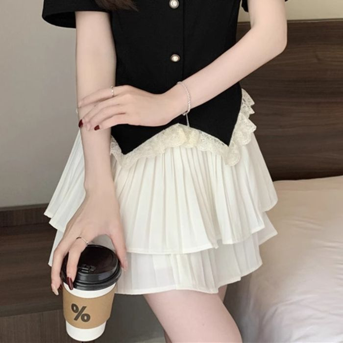 여름 새 플러스 사이즈 통통녀 여성의 순수한 욕망 레이스 바느질 짧은 소매 최고 연령 감소 케이크 스커트 학술 스타일 투피스 세트