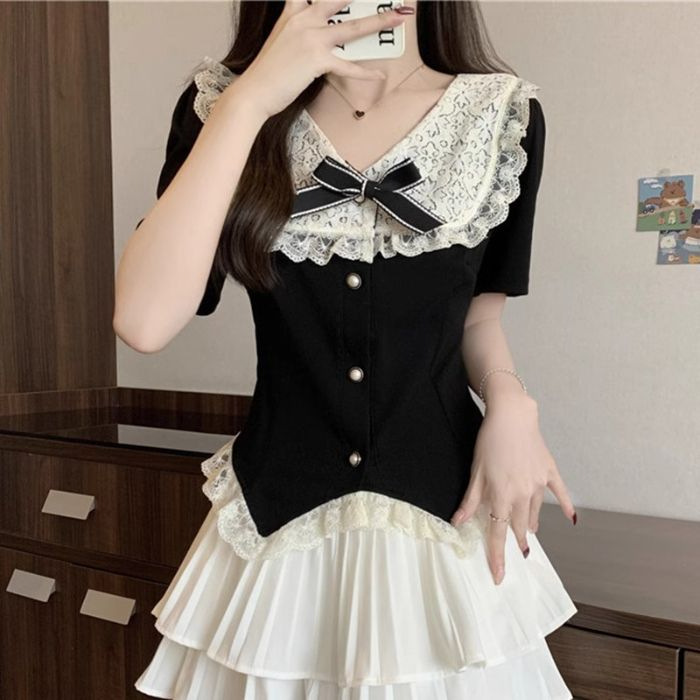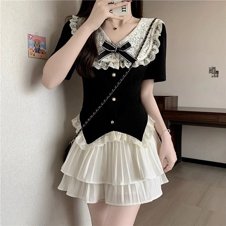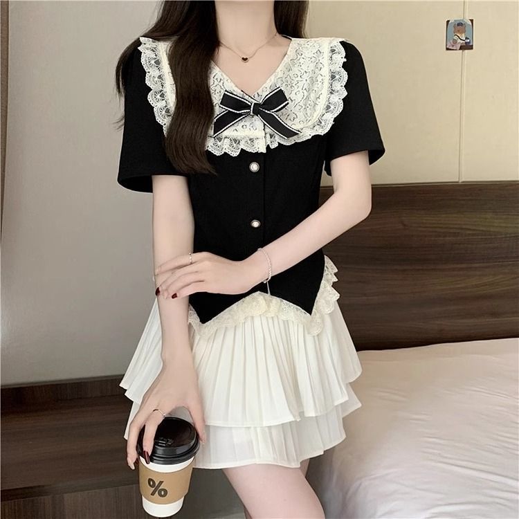 여름 새 플러스 사이즈 통통녀 여성의 순수한 욕망 레이스 바느질 짧은 소매 최고 연령 감소 케이크 스커트 학술 스타일 투피스 세트스토어 가기
