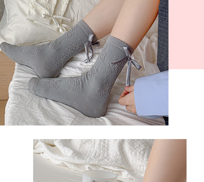 봄과 여름 회색 활 뼈없는 양말 Miu 시리즈 일본 3 차원 Anaglyph Bear Mid-Cylinder All-Match Girls 스택 양말스토어 가기