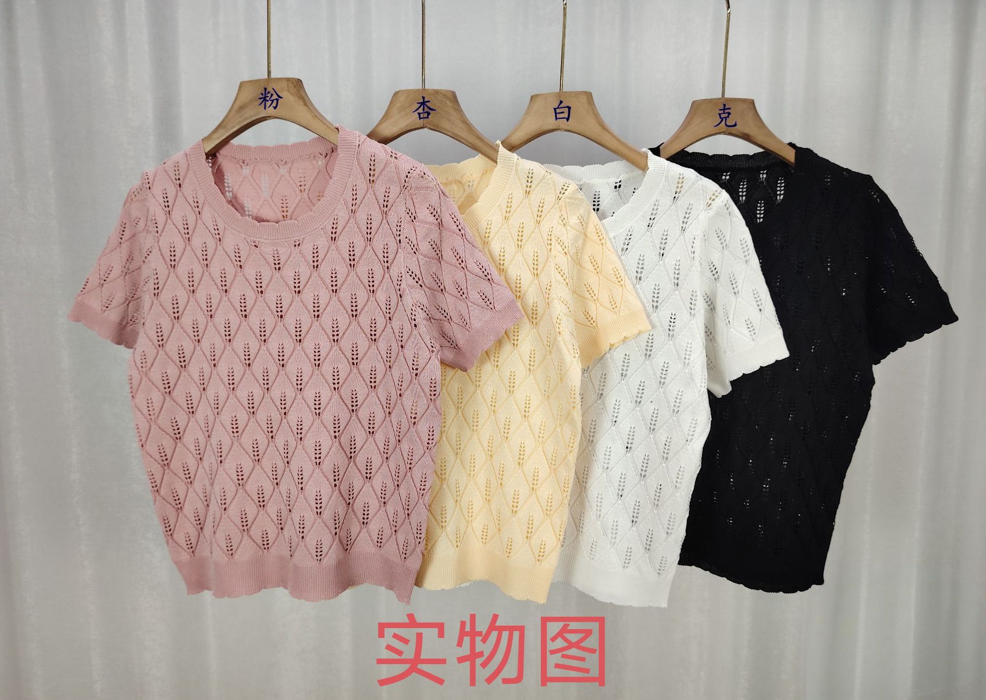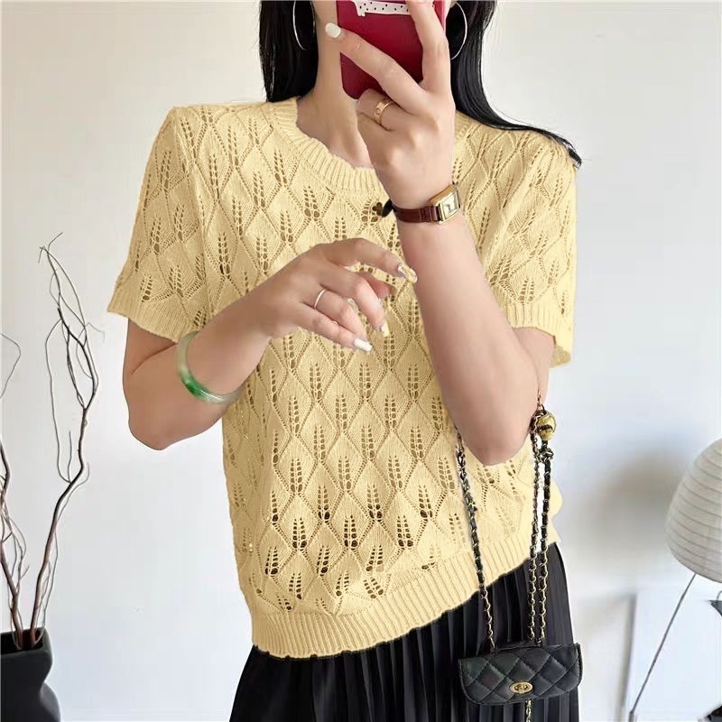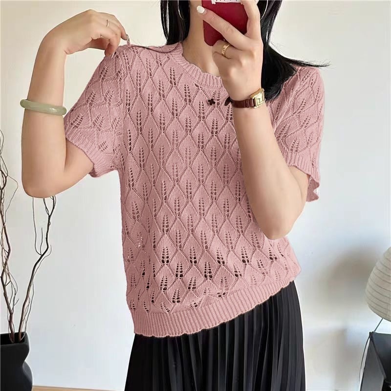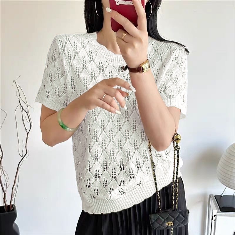 2025 여름 새로운 라운드 넥 풀오버 니트 솔리드 컬러 할로우 반팔 티셔츠 탑 여성 기질 통기성 디자인 감각스토어 가기