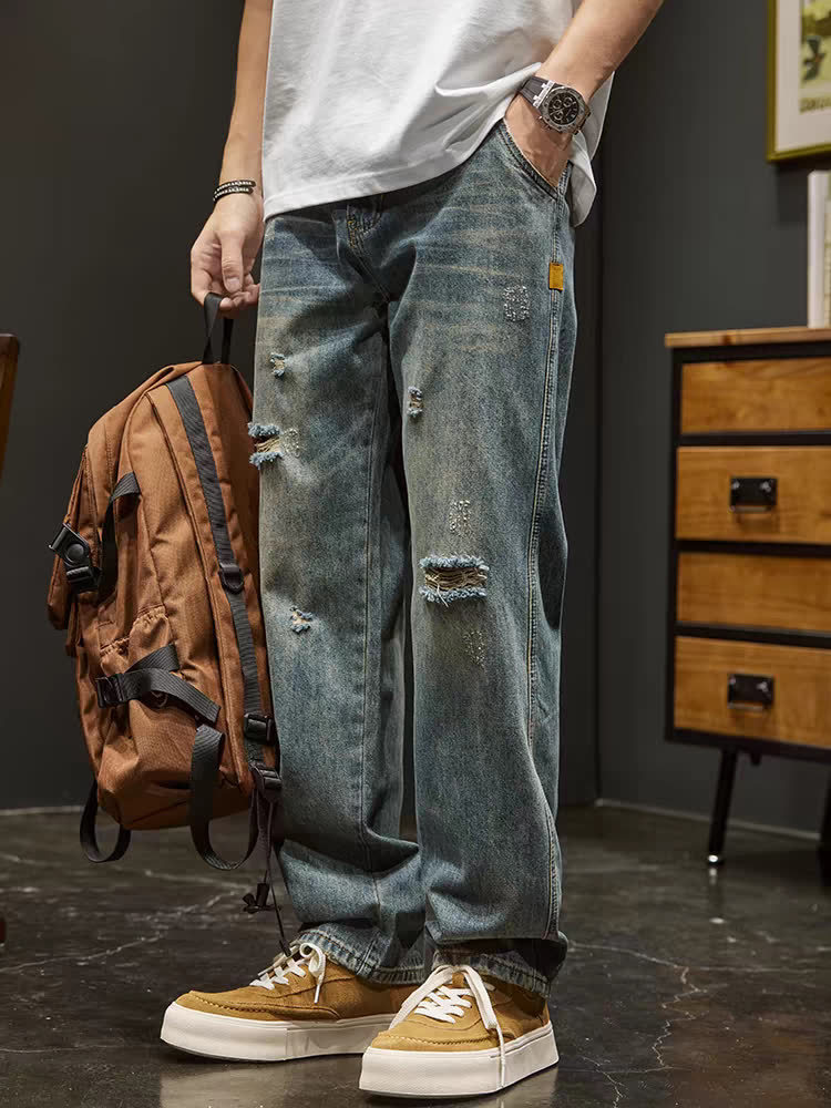 찢어진 청바지 남자 여름 새로운 복고풍 오래된 캐주얼 바지 미국 스타일 하이 스트리트 느슨한 스트레이트 바지스토어 가기