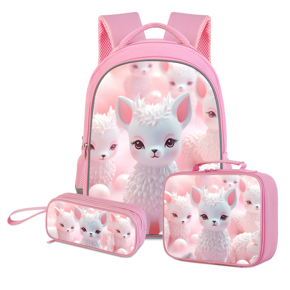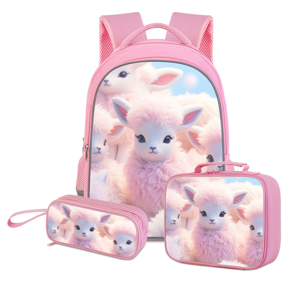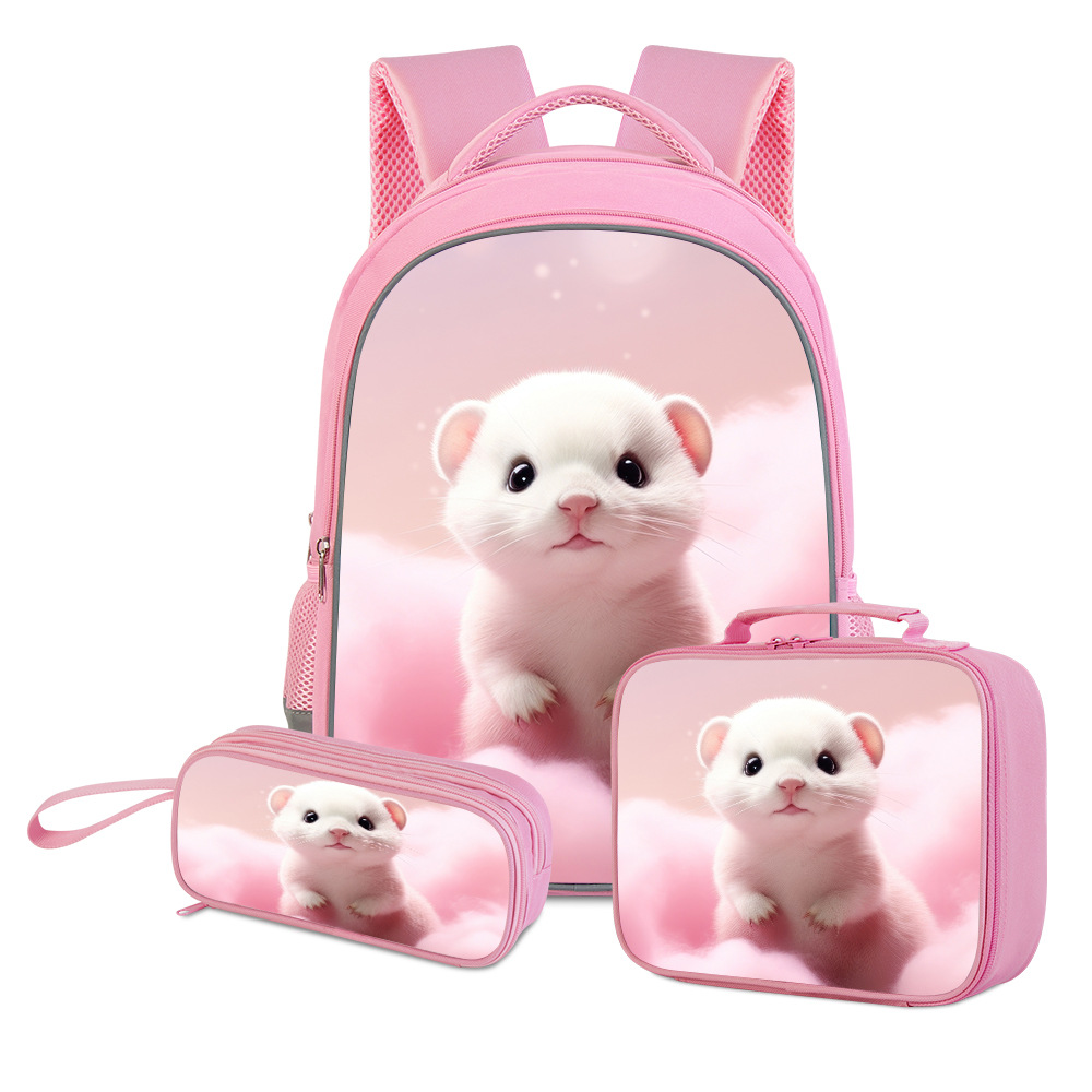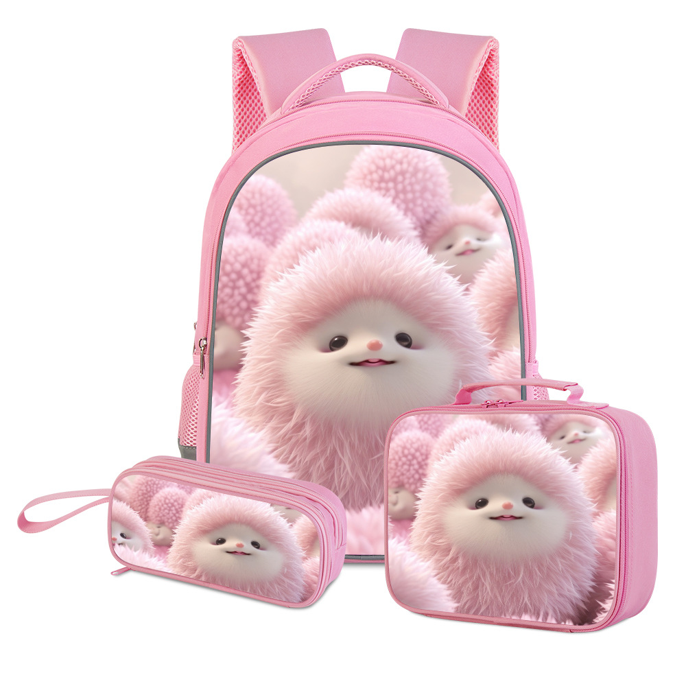 外贸定制可爱萌宠双肩包 17寸粉色双层学生书包笔袋餐包三件套