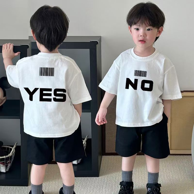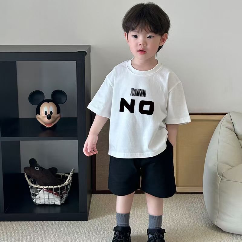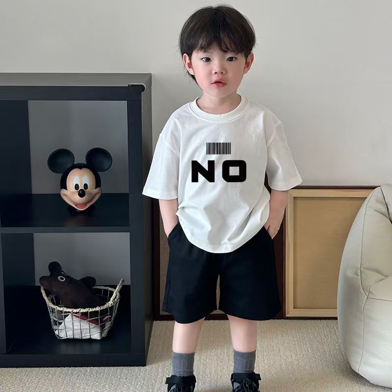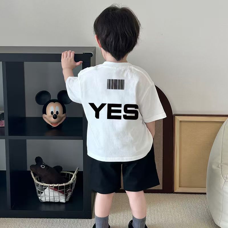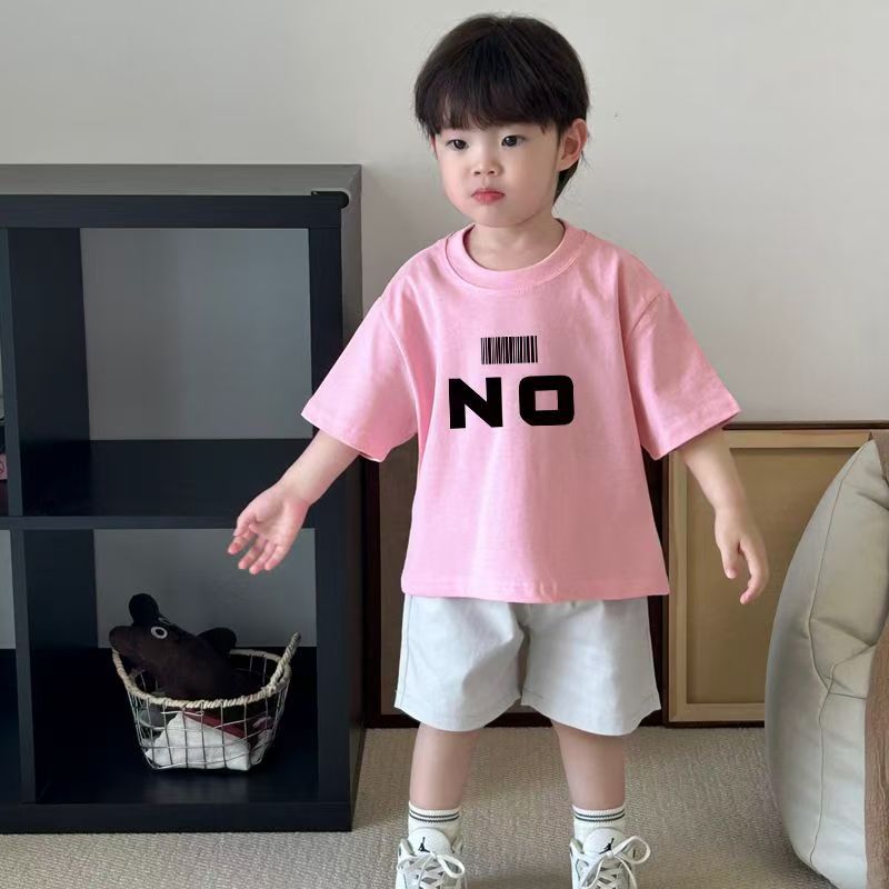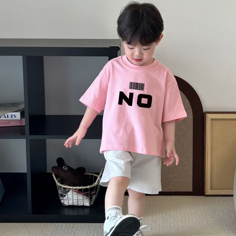 2025 봄과 여름 새로운 소년 면화 아동베이스 셔츠 아기 인쇄 상단 간단한 짧은 소매 라운드 목 풀오버스토어 가기