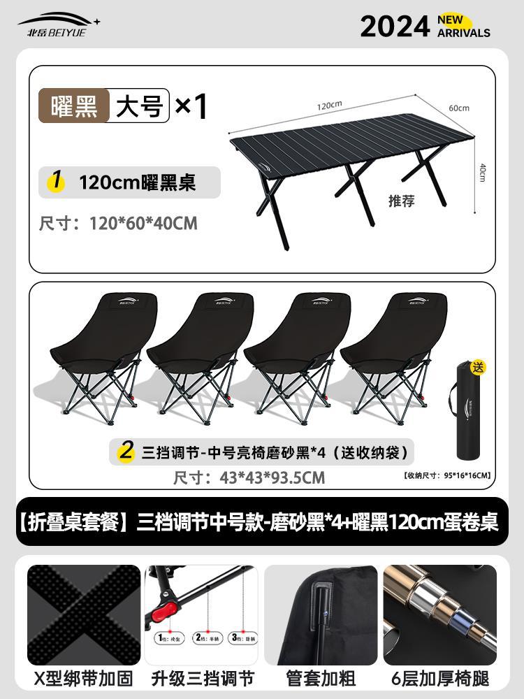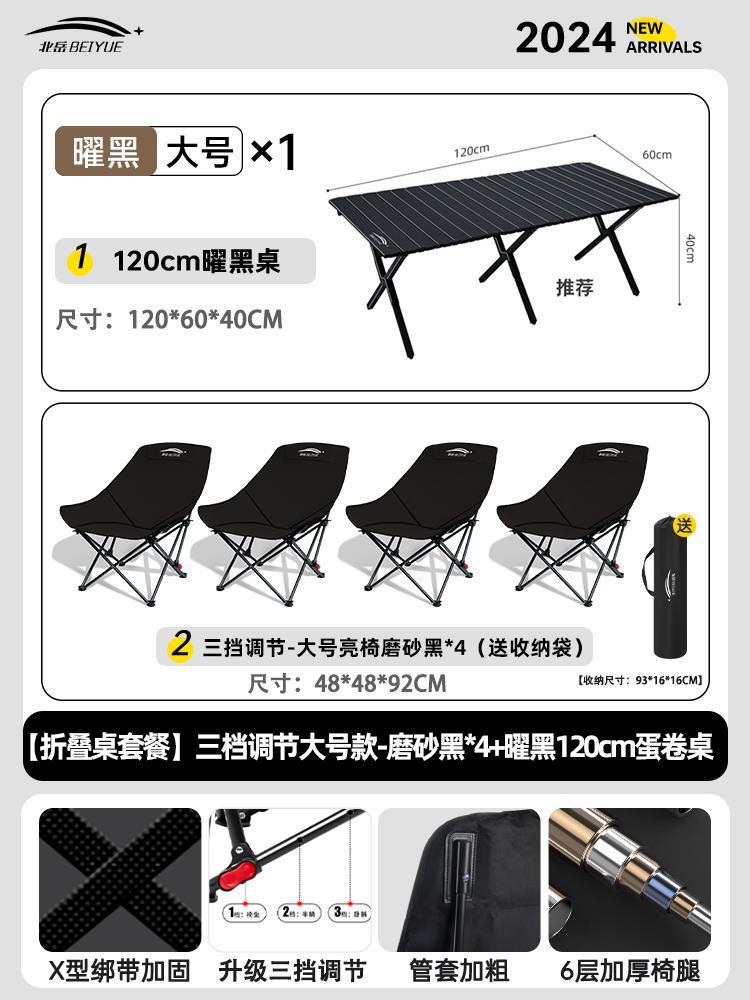 • [접이식 테이블 패키지] 3단 조절 가능한 대형 모델 - 매트 블랙*4 + 옵시디언 블랙 120cm 에그롤 테이블