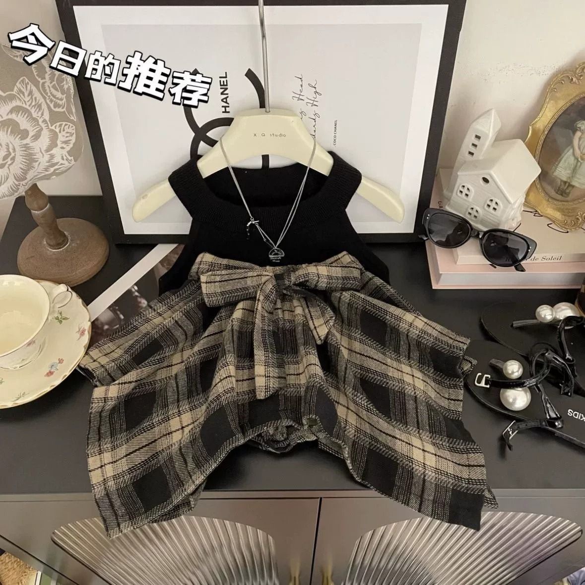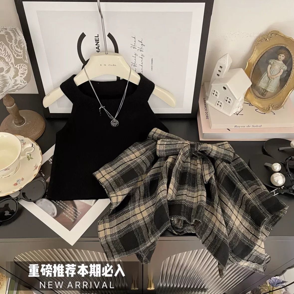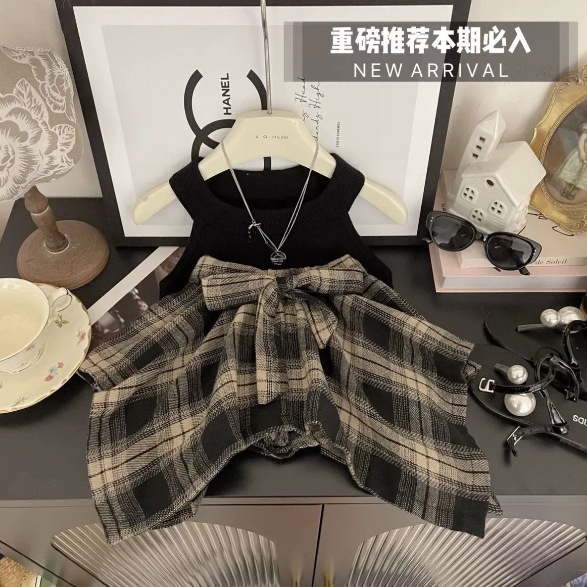 여름 소녀 세트 아기 서양식 어린이 성격 유행 인터넷 인기있는 유행 한국 조끼 카미솔 격자 무늬 짧은 문화