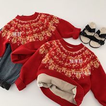 儿童红色毛衣2025冬装新款男女童红色费尔岛加厚针织衫宝宝拜年服