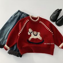麦宝红色毛衣2025冬季新款男女童新年小马套头针织衫宝宝拜年服潮