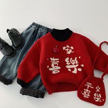 儿童红色毛衣2025冬装新款潮男童平安喜乐套头针织衫女宝宝拜年服