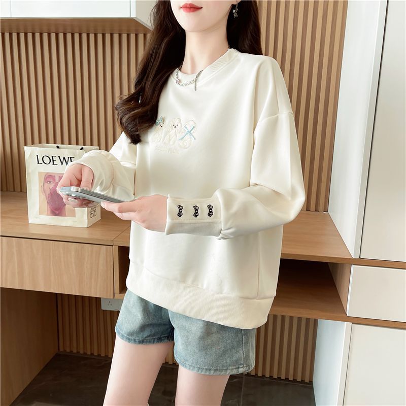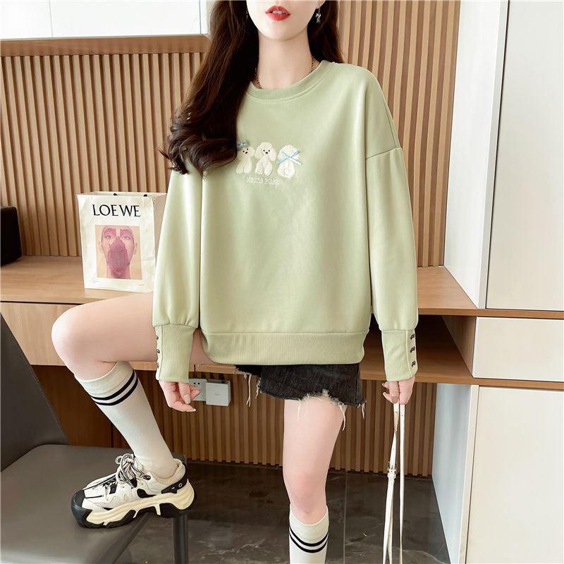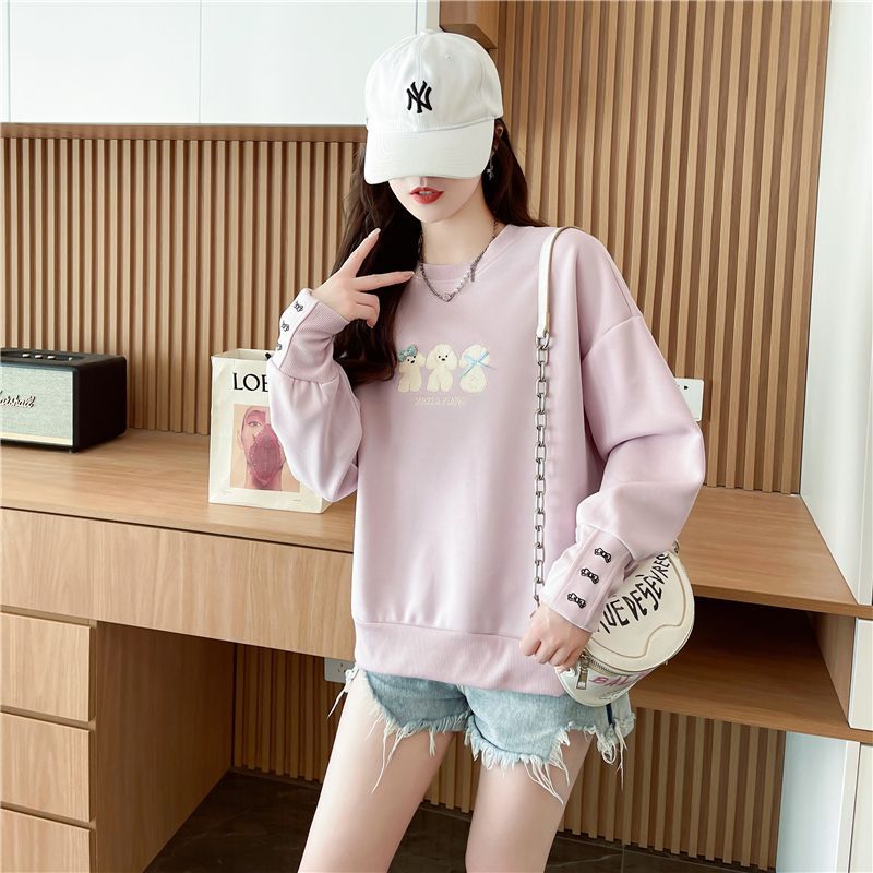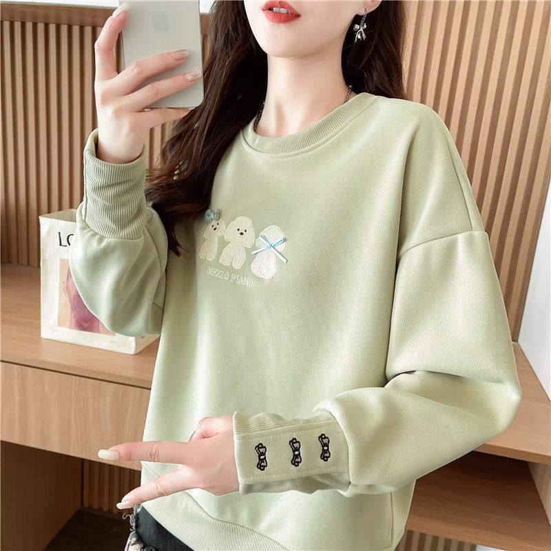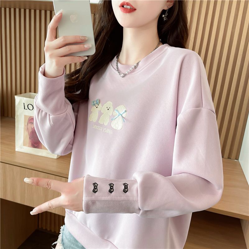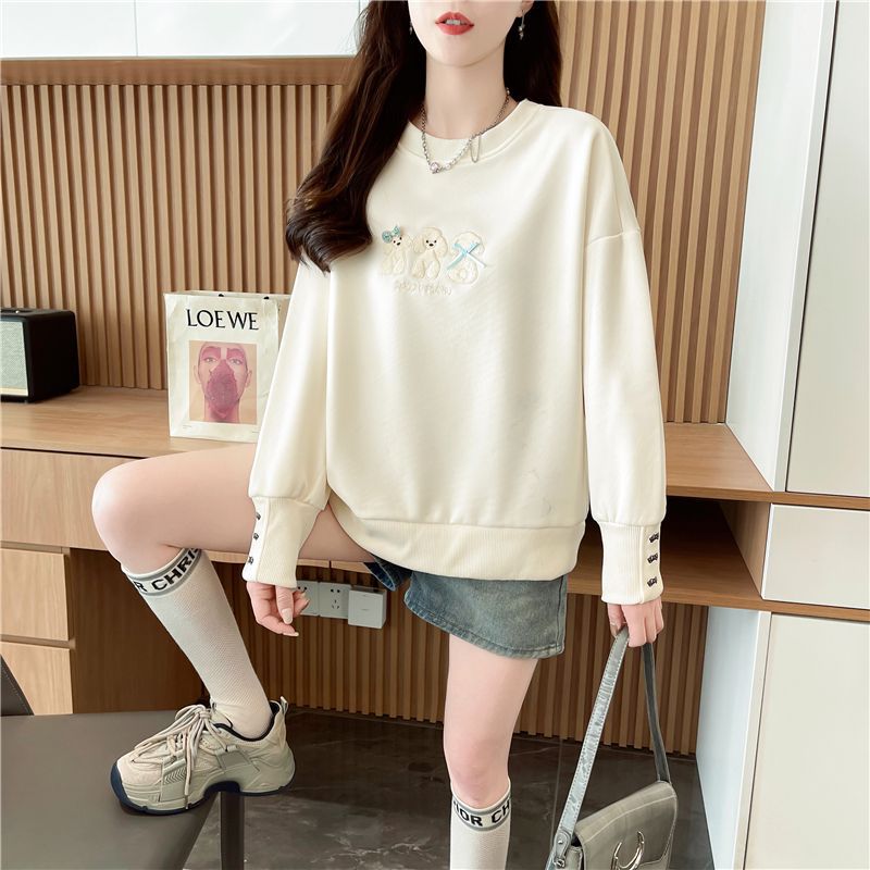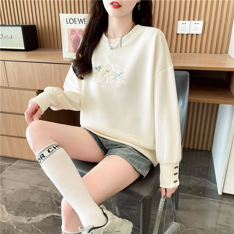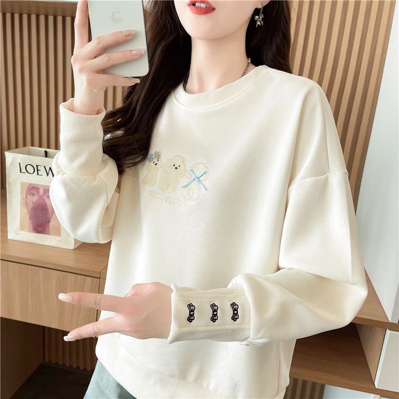 플러스 사이즈 통통녀 슬림 강아지 자수 폭발 둥근 목 땀 여성의 봄과 가을 2025 얇은 틈새 느슨한 탑스토어 가기