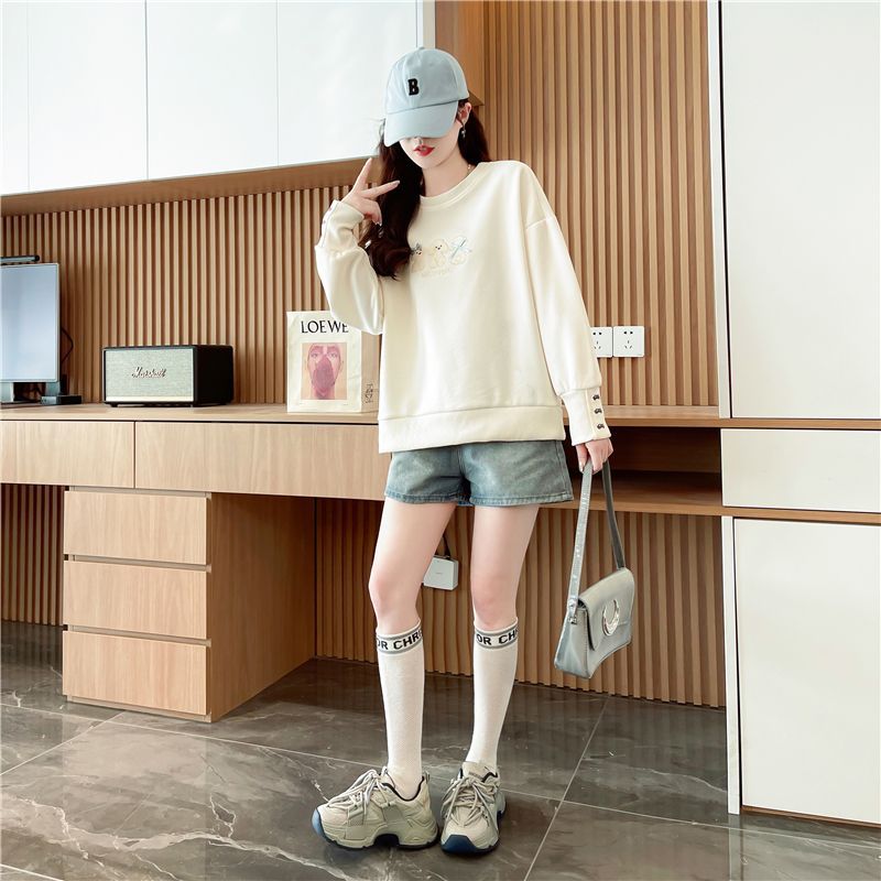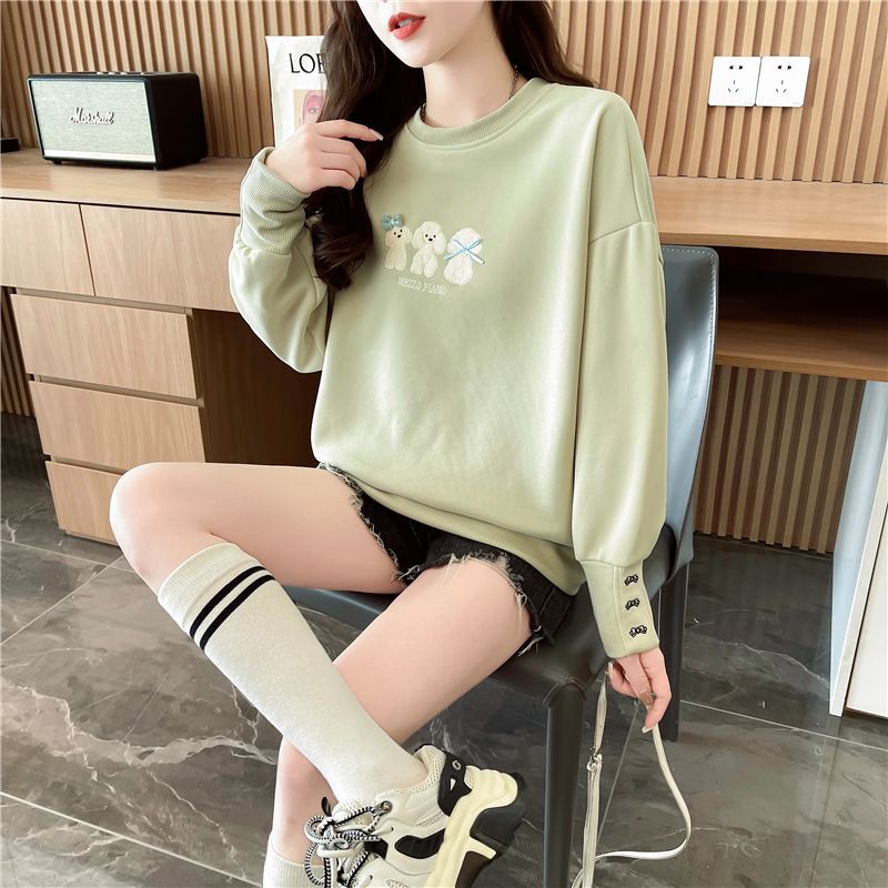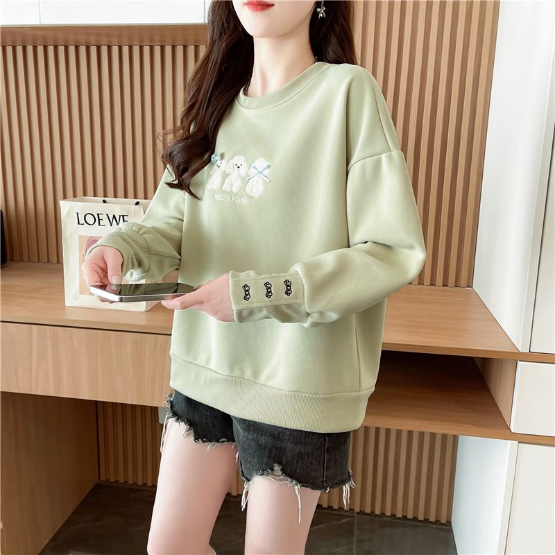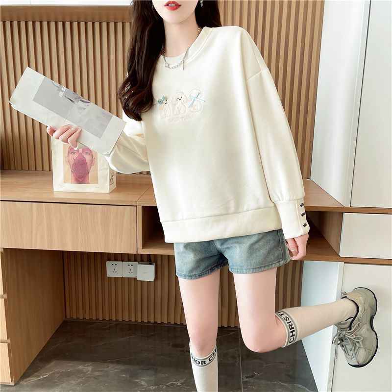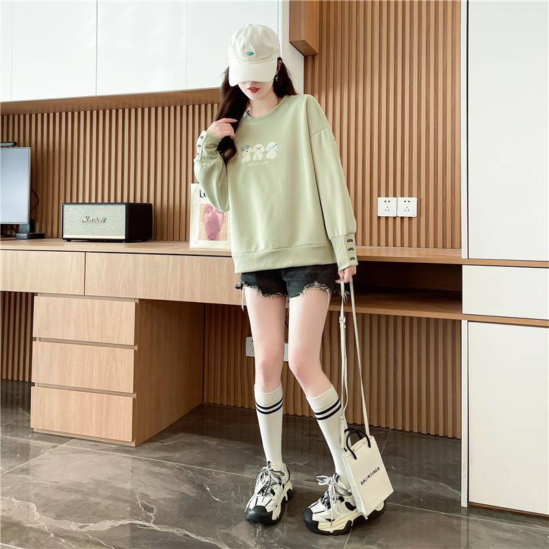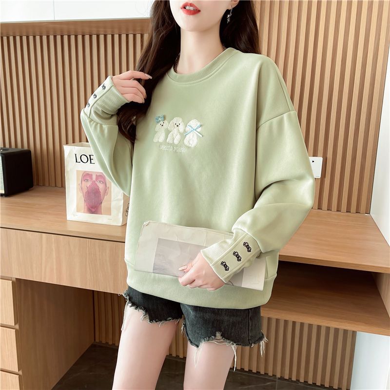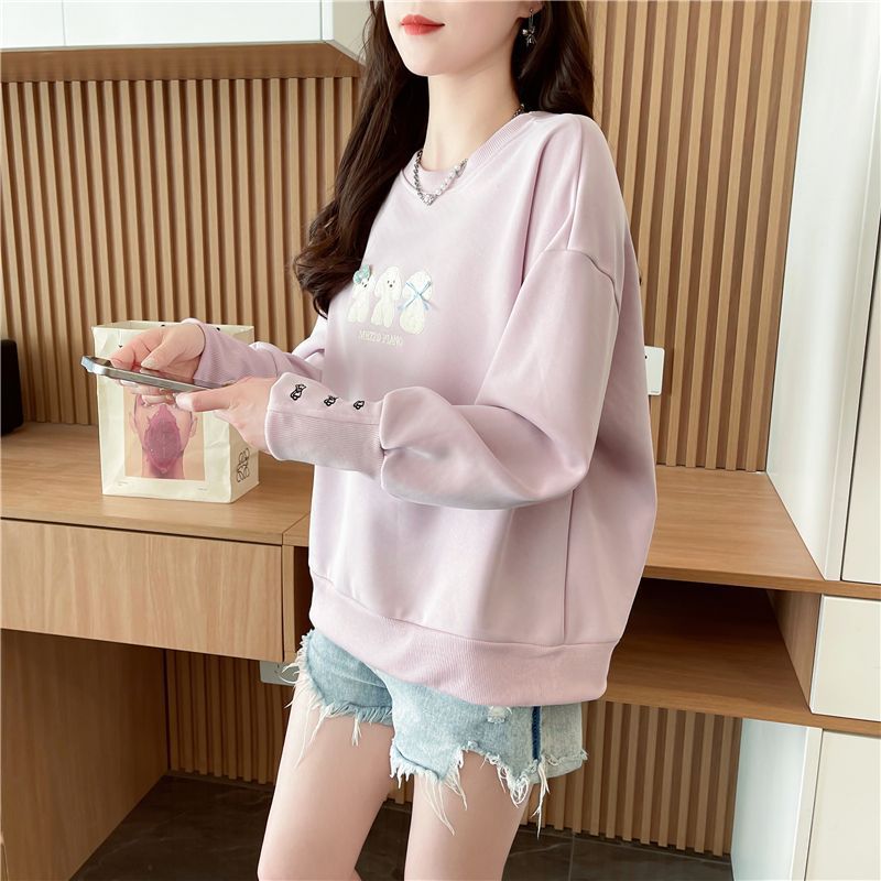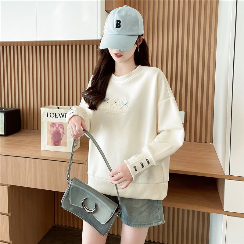 플러스 사이즈 통통녀 슬림 강아지 자수 폭발 둥근 목 땀 여성의 봄과 가을 2025 얇은 틈새 느슨한 탑스토어 가기