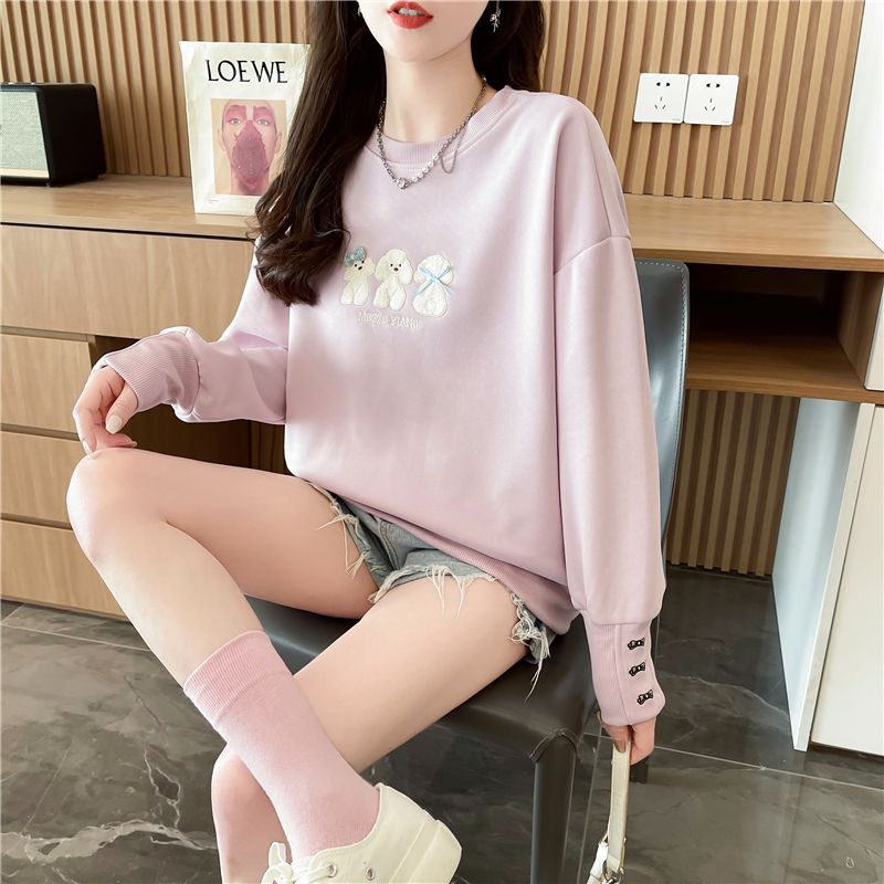 플러스 사이즈 통통녀 슬림 강아지 자수 폭발 둥근 목 땀 여성의 봄과 가을 2025 얇은 틈새 느슨한 탑