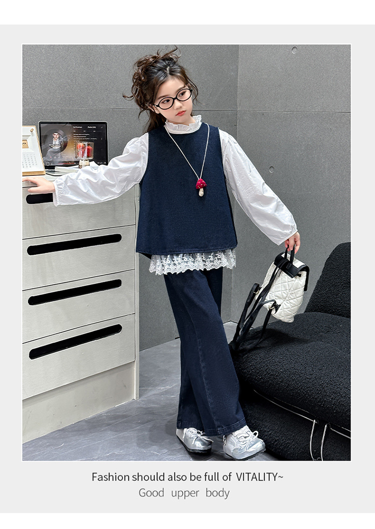 소녀 2025 봄 새로운 한국 스타일 데님 조끼 세트 큰 어린이 패션 레이스 셔츠 넓은 다리 바지 3 조각 세트스토어 가기
