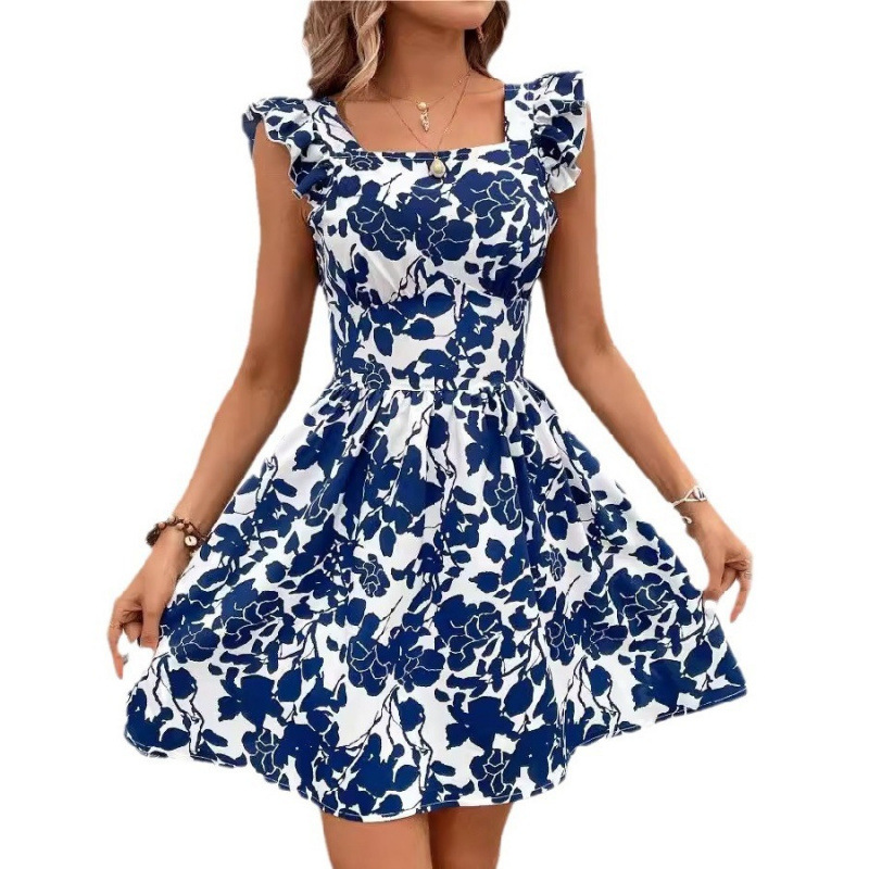 국경 2025 봄과 여름 새로운 유럽과 미국의 캐주얼 VCAY 여성용 러플 숄더 스트랩 전체 인쇄 레이스 업 원피스