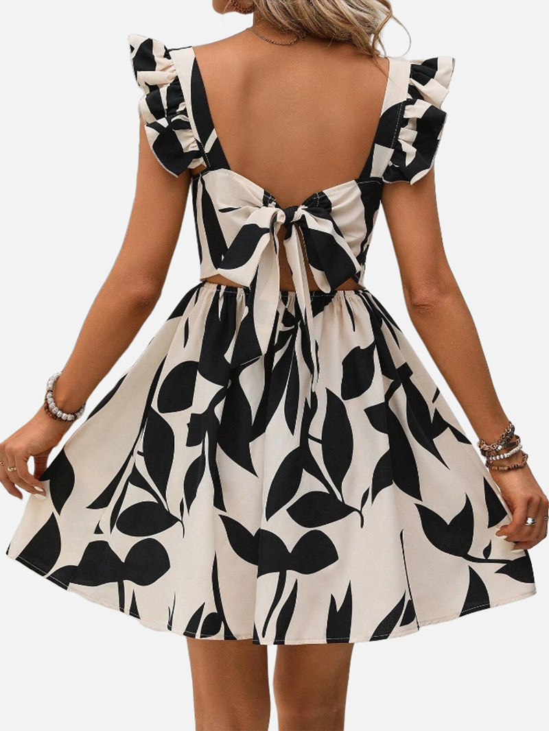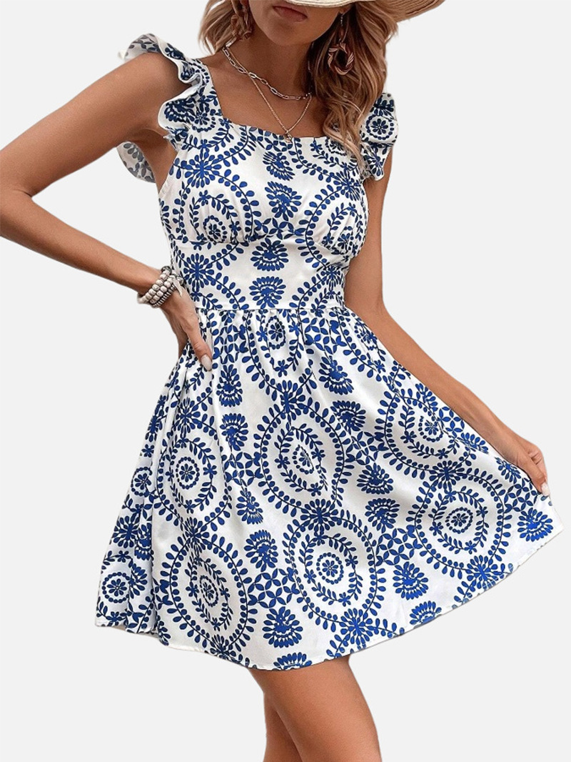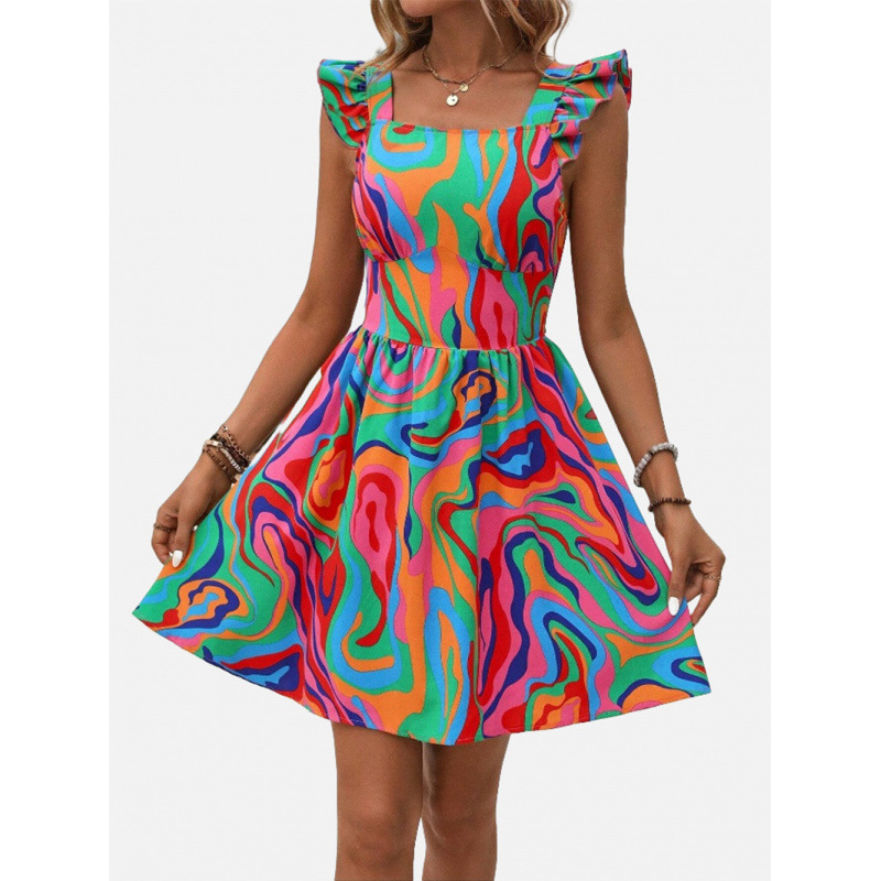 국경 2025 봄과 여름 새로운 유럽과 미국의 캐주얼 VCAY 여성용 러플 숄더 스트랩 전체 인쇄 레이스 업 원피스스토어 가기