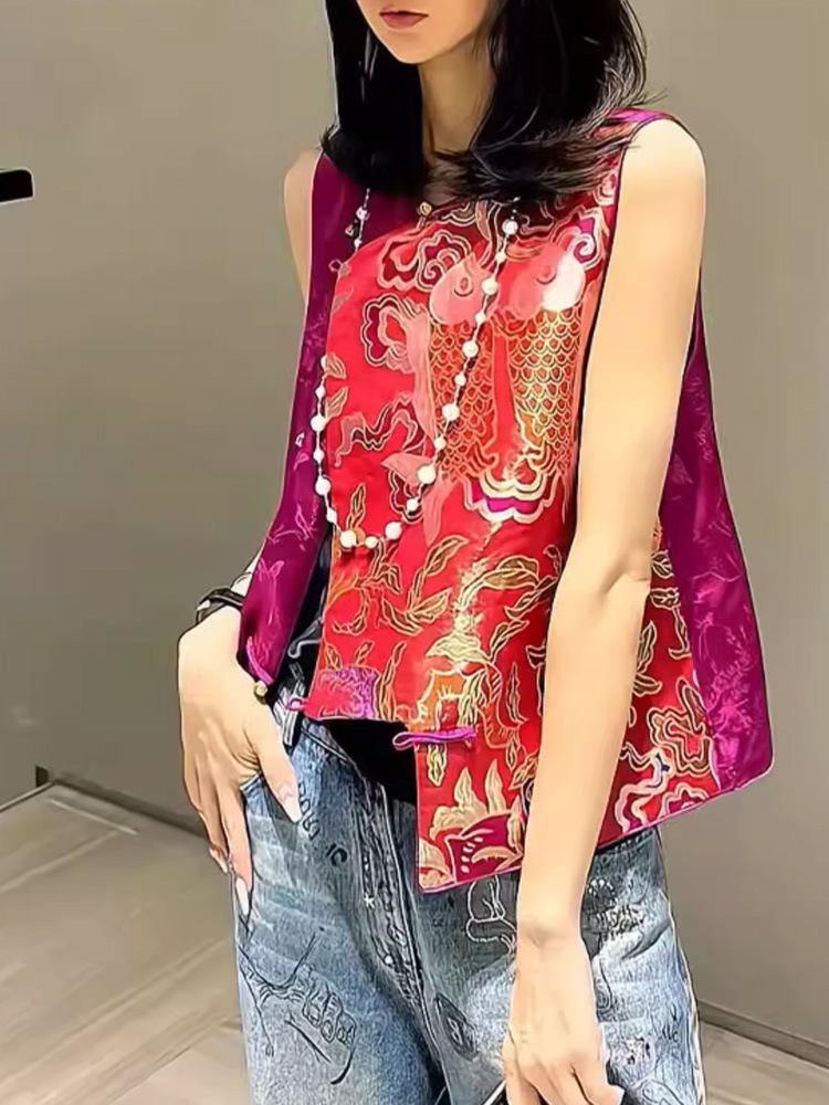 새로운 중국 복고풍 국가 스타일 2025 새로운 올해 인기있는 로즈 레드 스티칭 플레이트 버클 외부 양복 조끼 여름 여성 의류