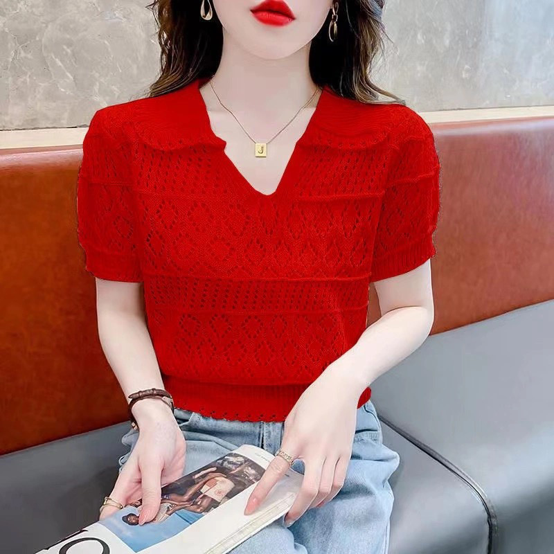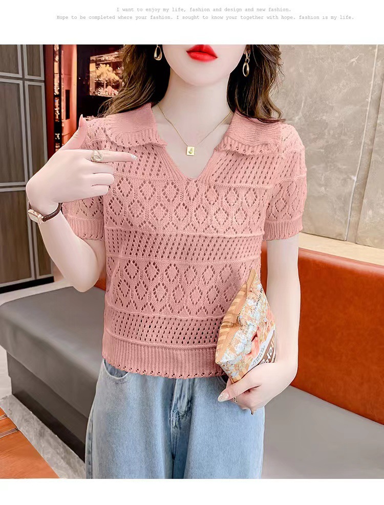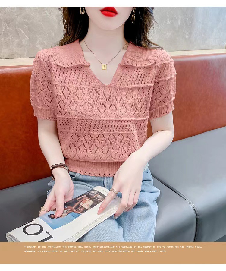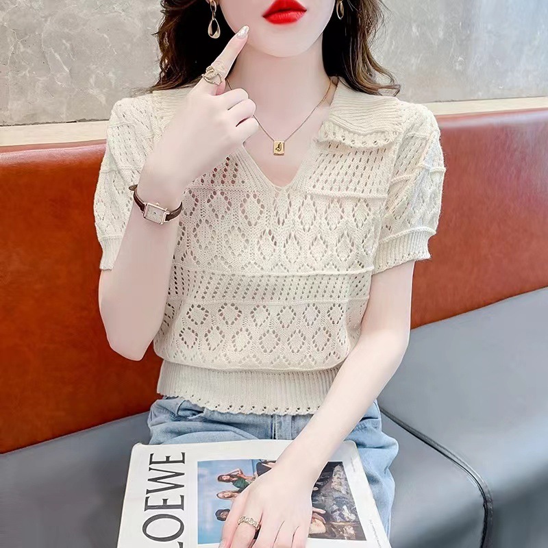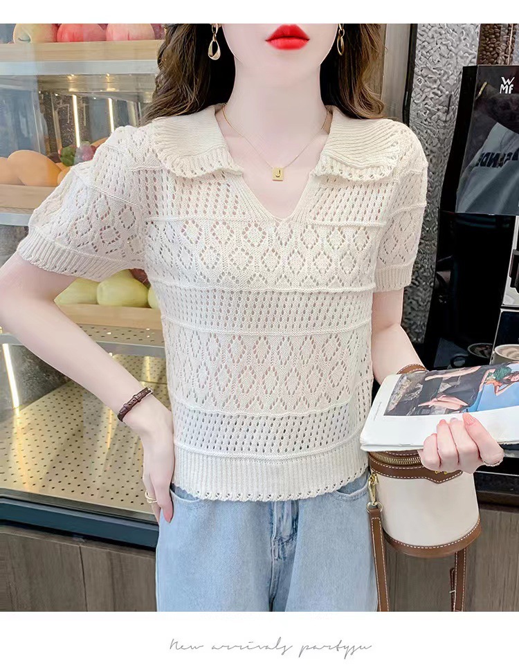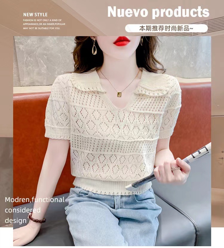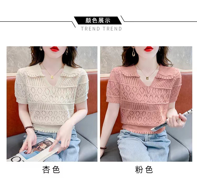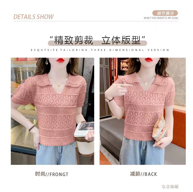 2025 년 여름 새로운 아이스 실크 니트 스웨터 반팔 여성 웨이스트 할로우 얇은 느슨한 폴로 칼라 탑 크로스-국경스토어 가기