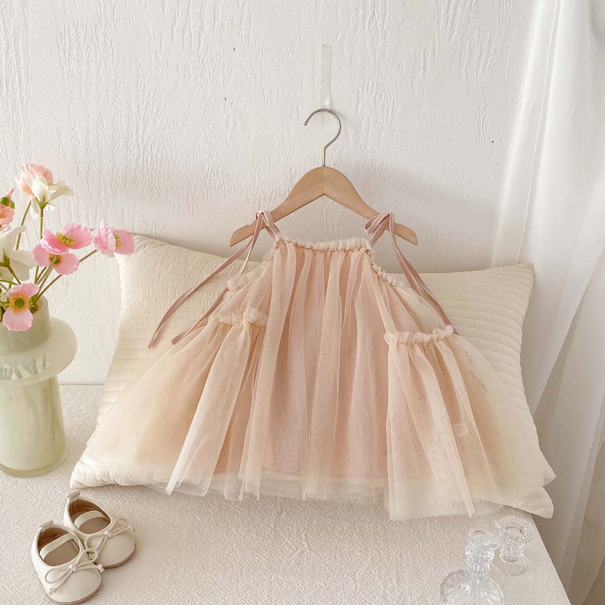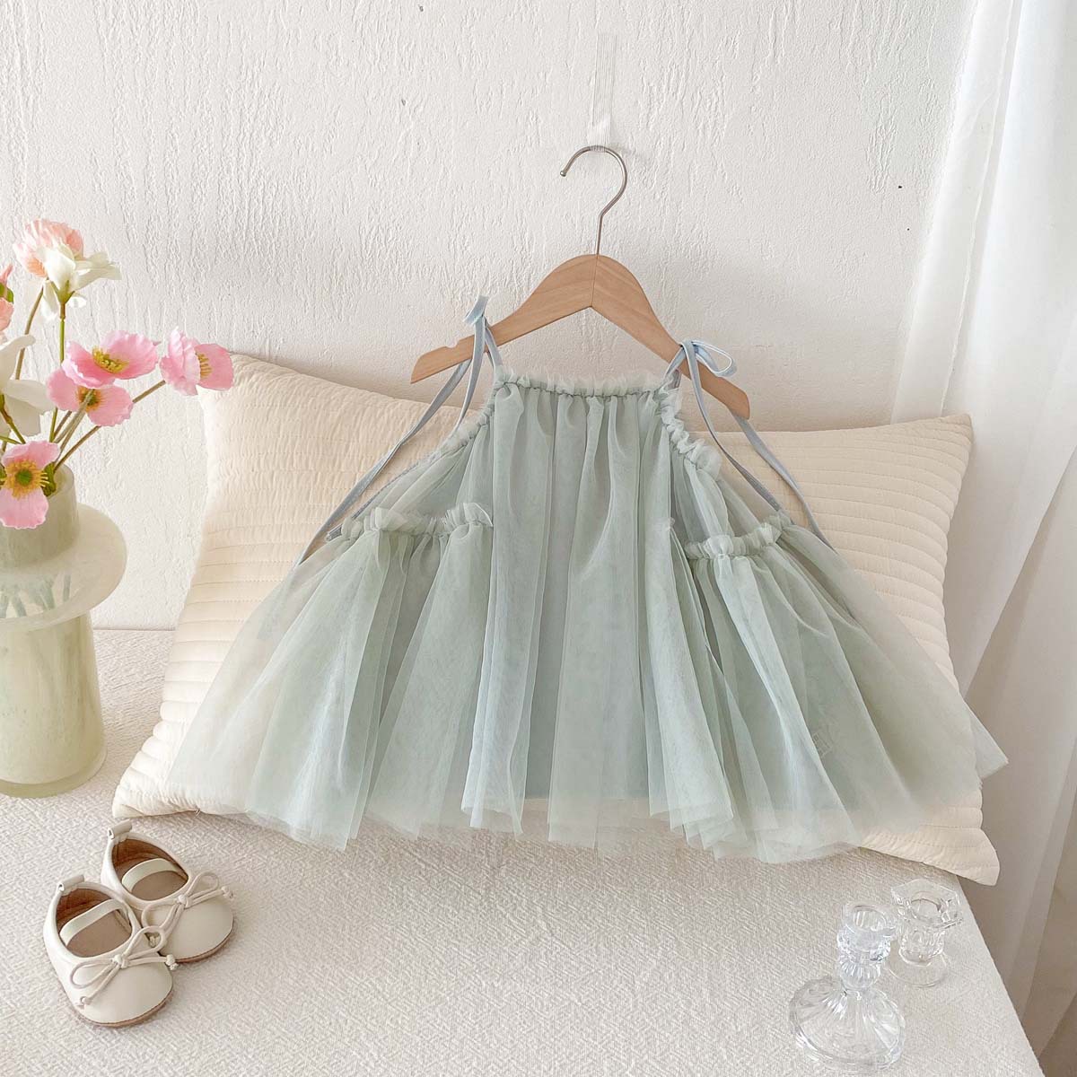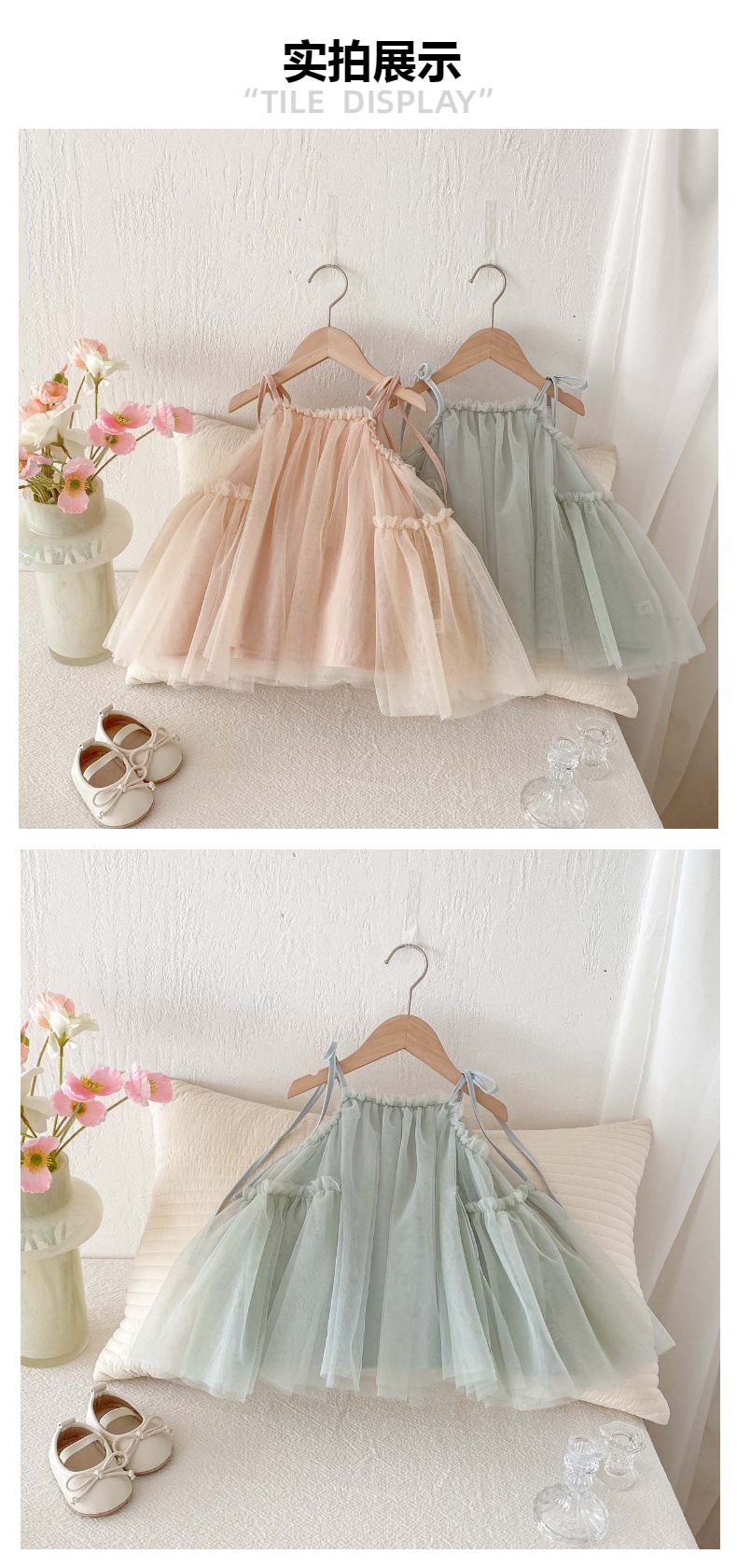 INS 한국 스타일 소녀 스트랩 메쉬 스커트 여름 새로운 아기 아기 달콤한 활 공주 원피스