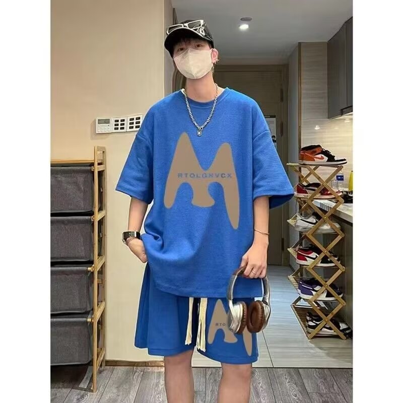 트렌디 한 브랜드 헤비 반팔 티셔츠 남성 여름 캐주얼 세트 십대 유행 착용 잘 생긴 반바지 투피스 세트스토어 가기