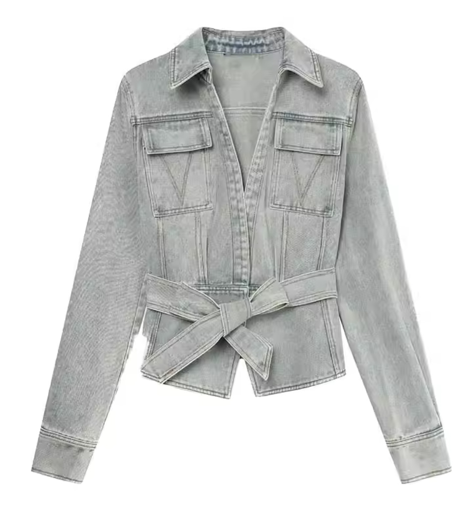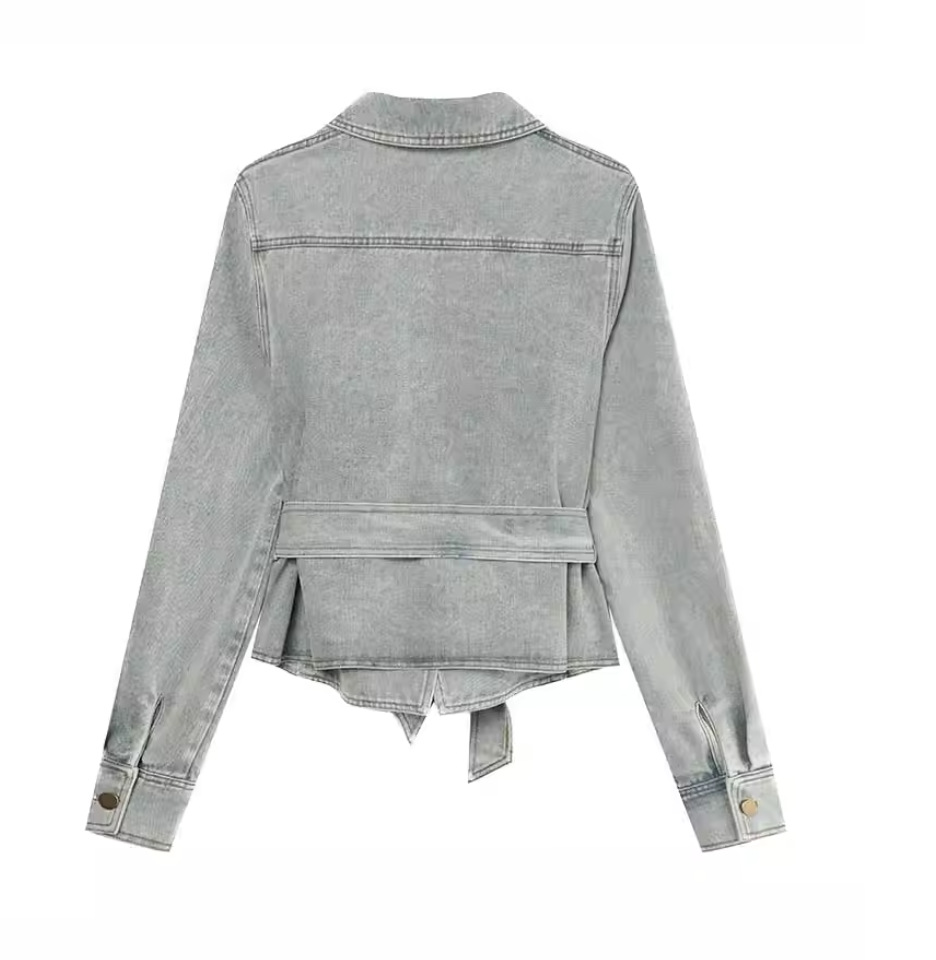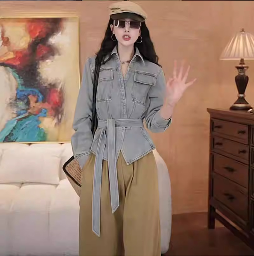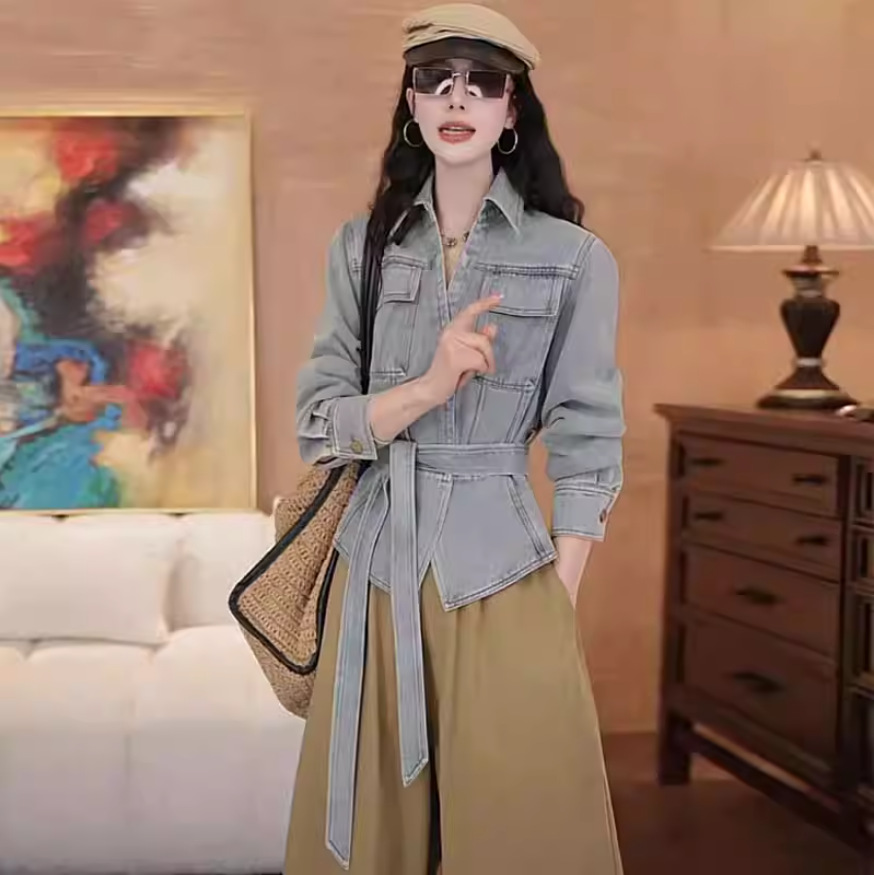 뜨거운 소녀 타이트 허리 스트랩 데님 셔츠 여성용 봄과 가을 새로운 빈티지 슬림 핏 캐주얼 슬림 핏 카디건 코트 트렌디 코트스토어 가기