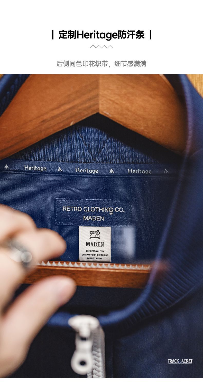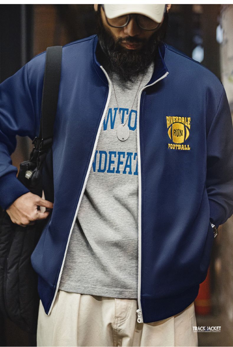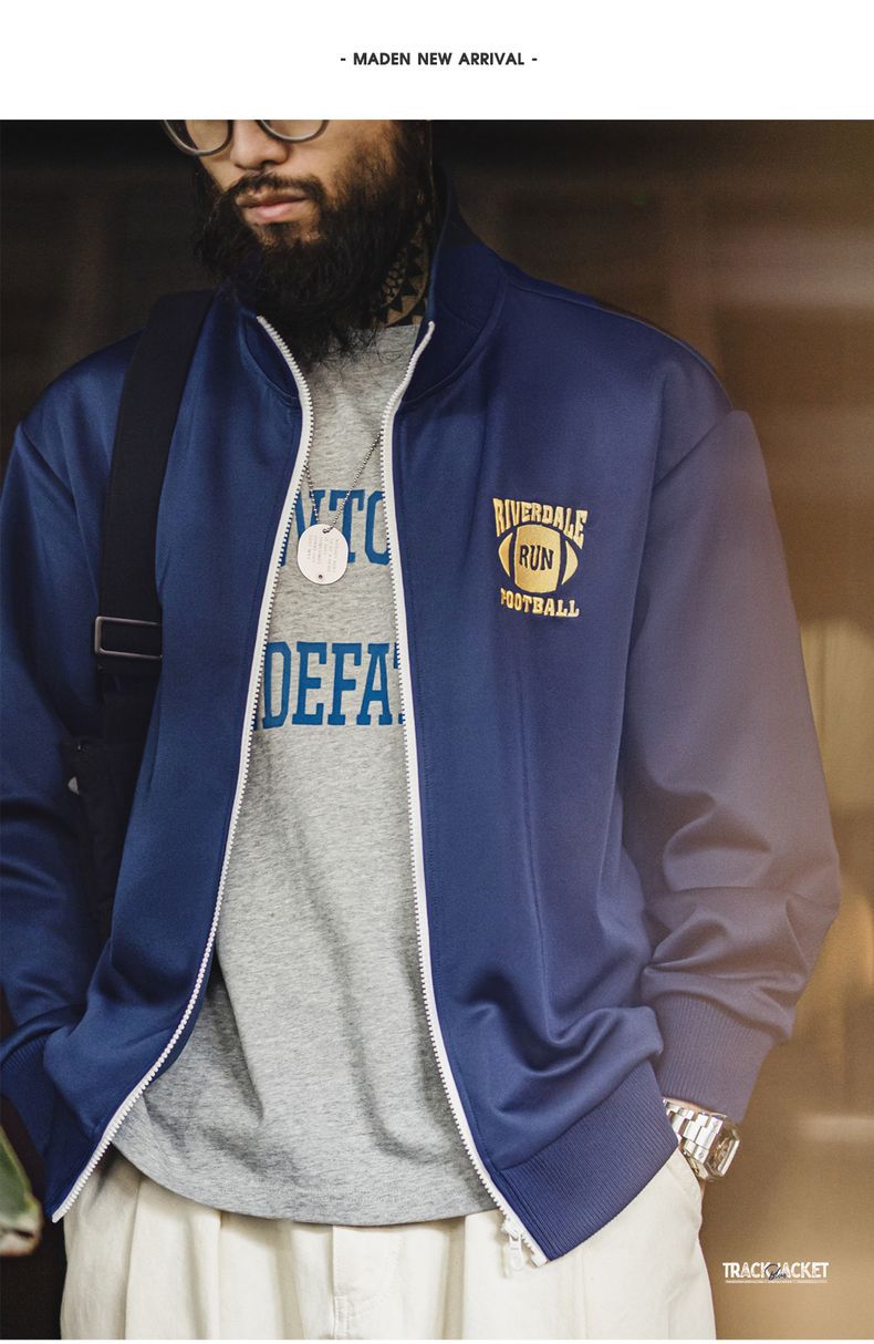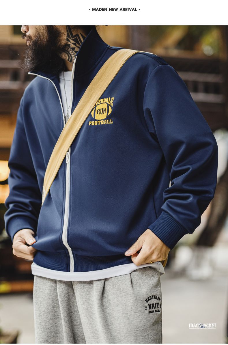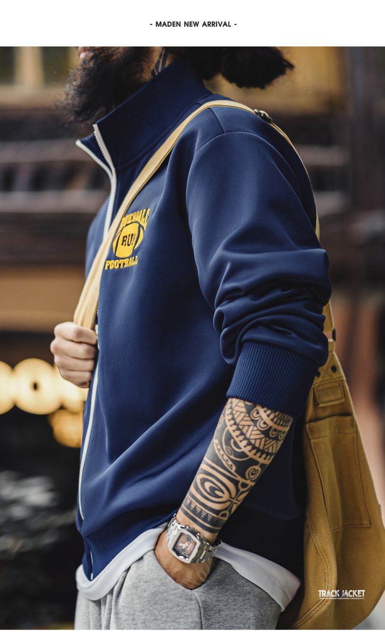 마든 워크웨어 아메리칸 캐주얼 컬리지 스타일 배색 자수 재킷 에어 레이어 스탠드 칼라 루즈핏 가디건 스웨트셔츠 남성 가을