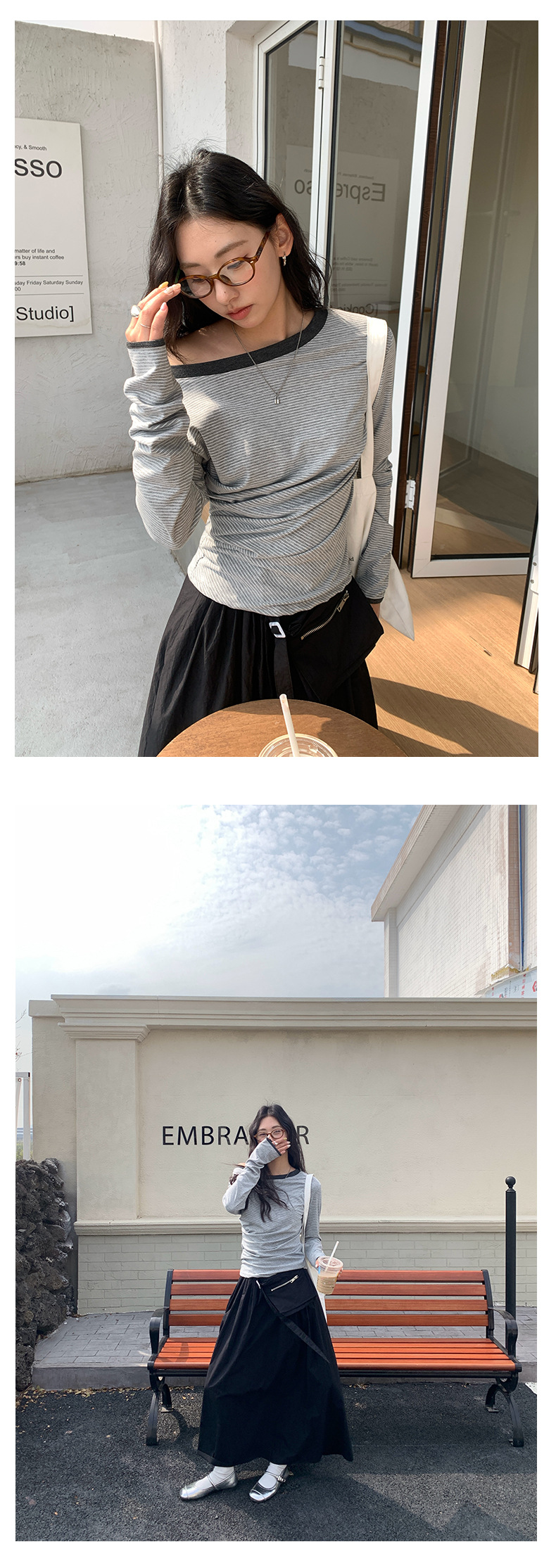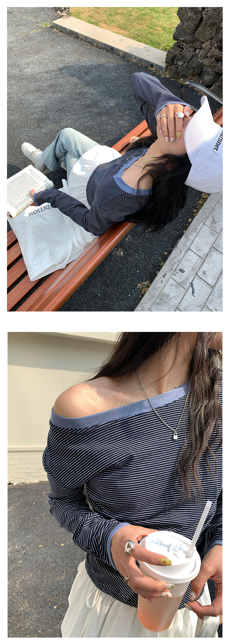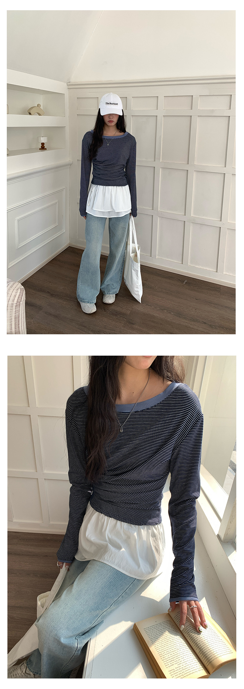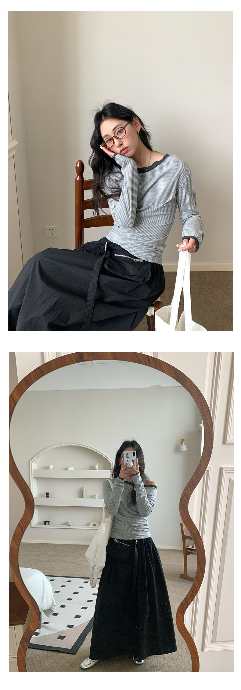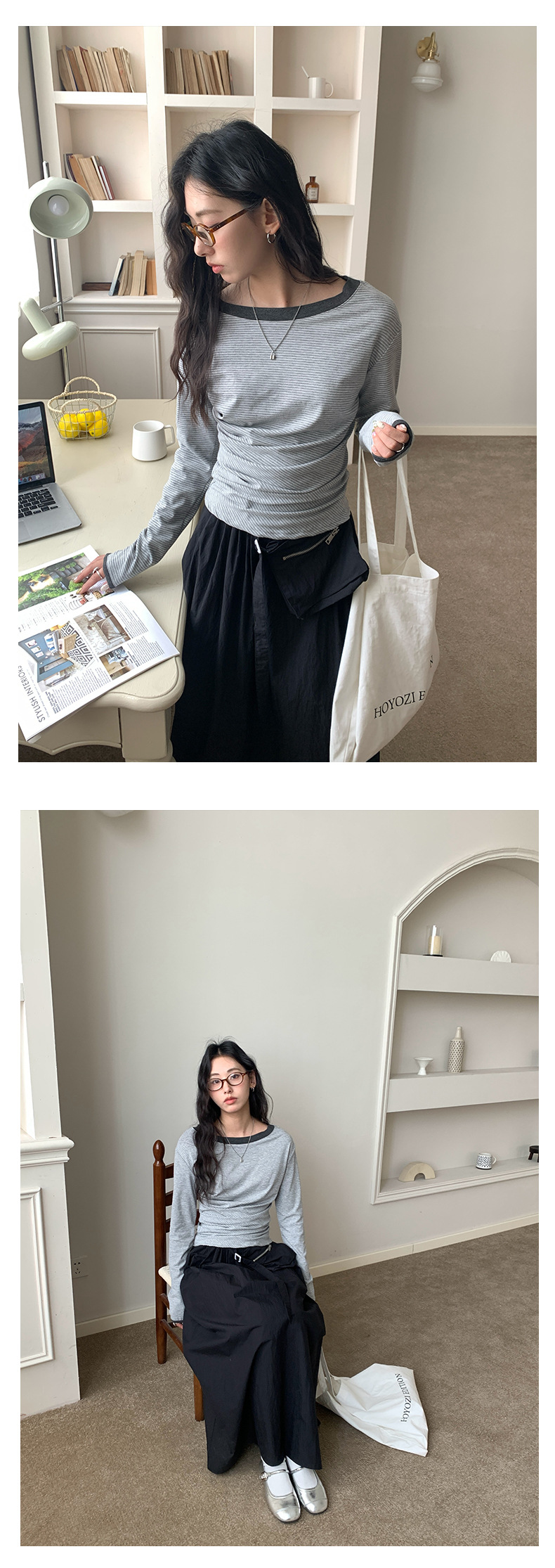 Huang Zheng 컬러 대비 칼라 칼라 사이드 플리트 디자인 긴 소매 티셔츠 여성용 2025 스프링 스트라이프 탑 H1DC510094