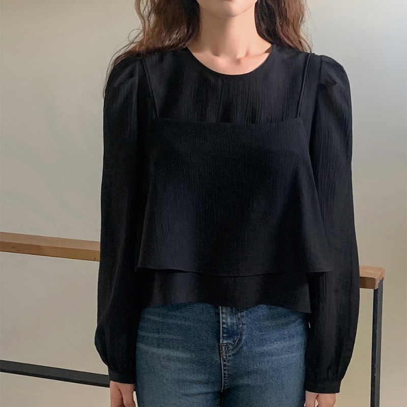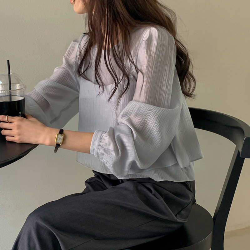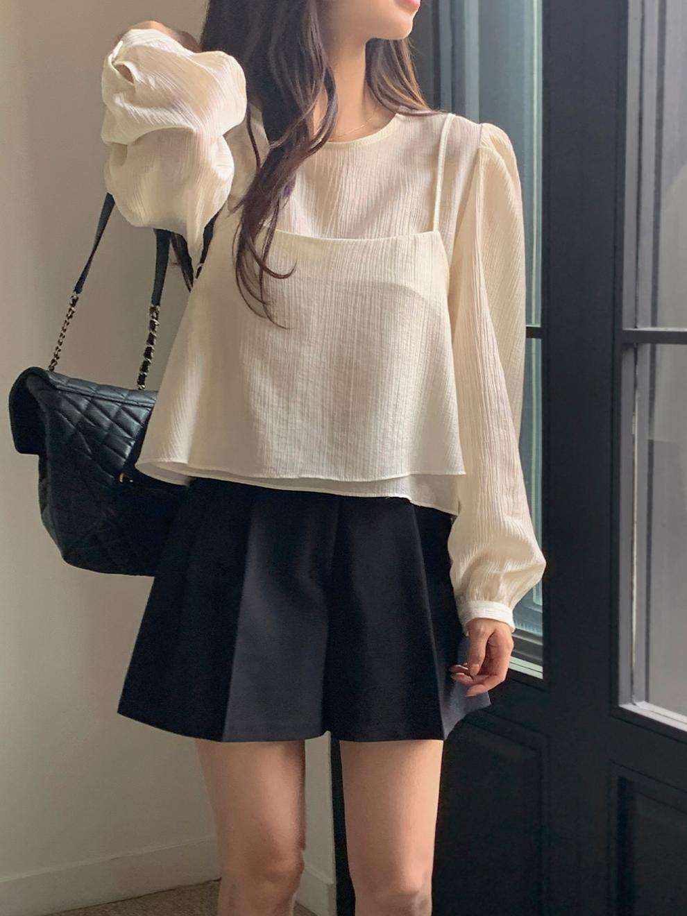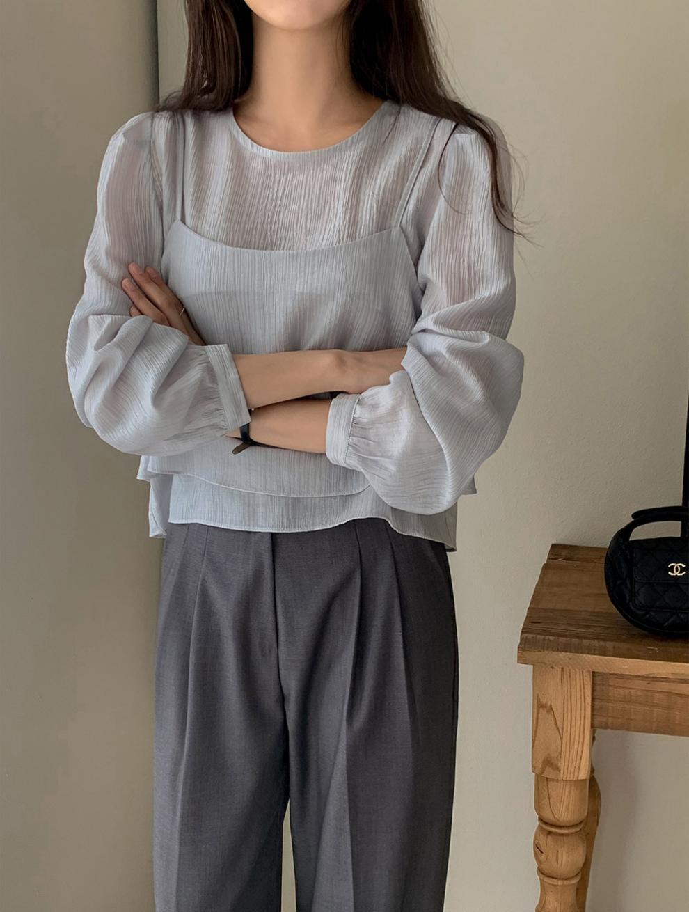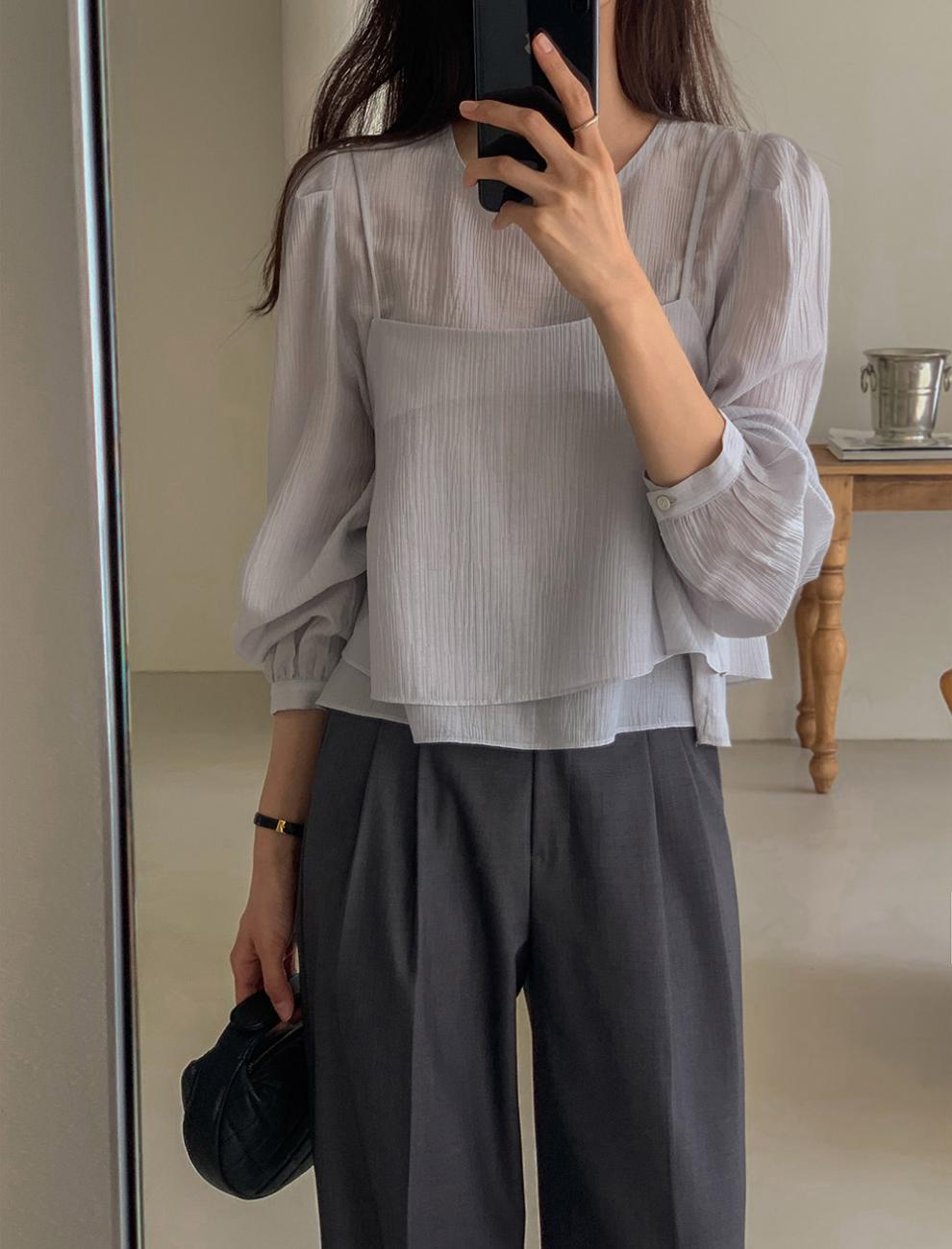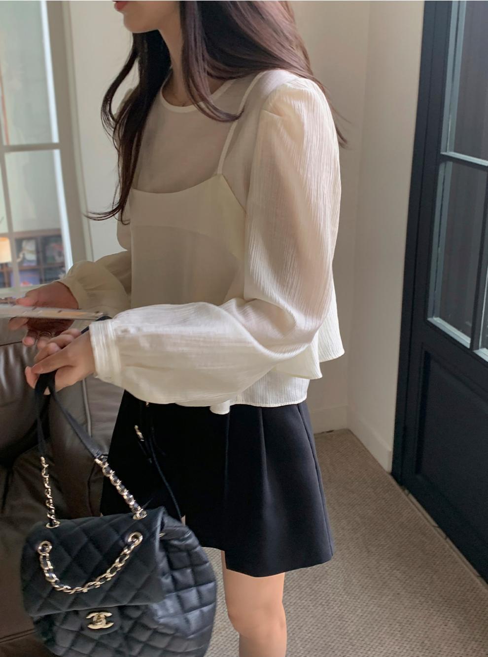 프랑스 시폰 셔츠 여성용 세련된 틈새 디자인 관점 작은 셔츠 스트랩 조끼 독특한 긴 소매 셔츠 투피스 세트스토어 가기