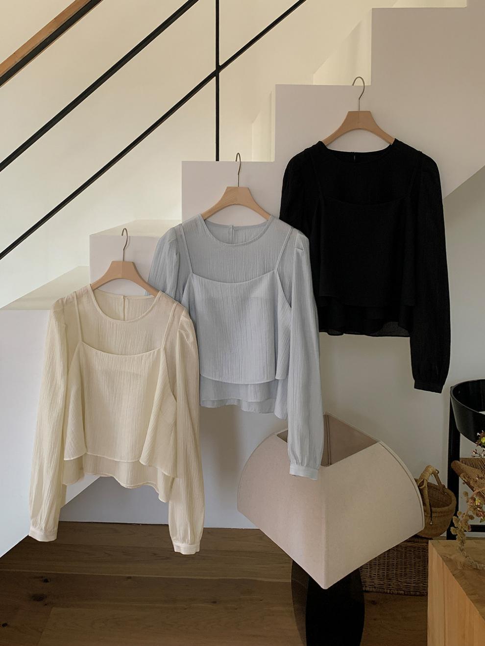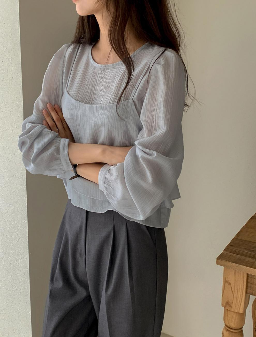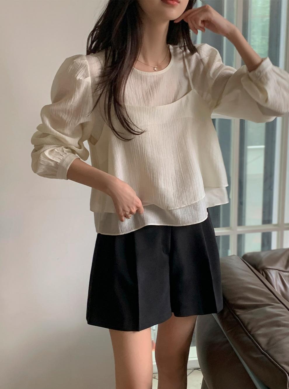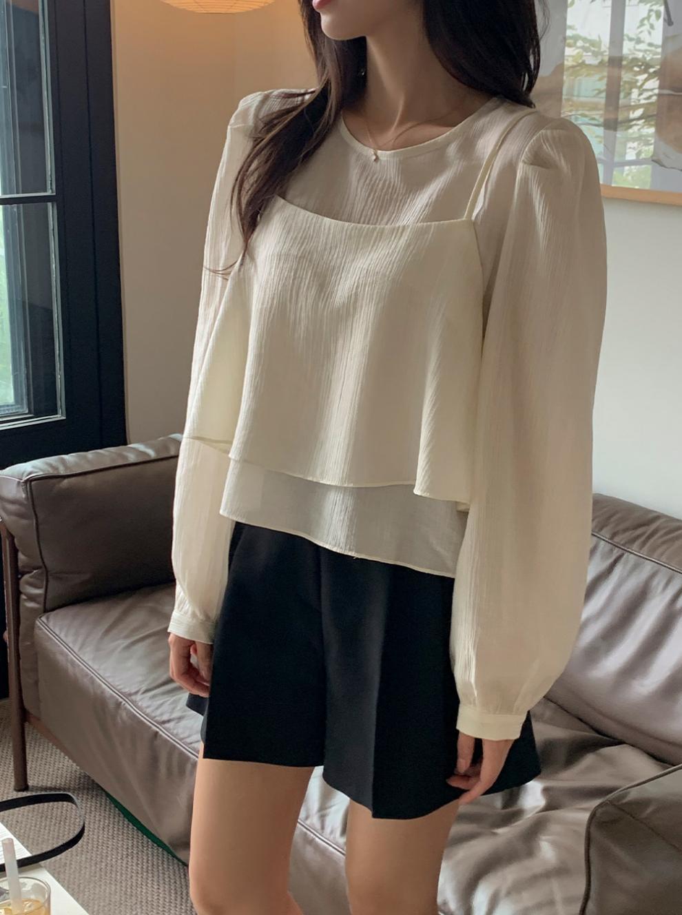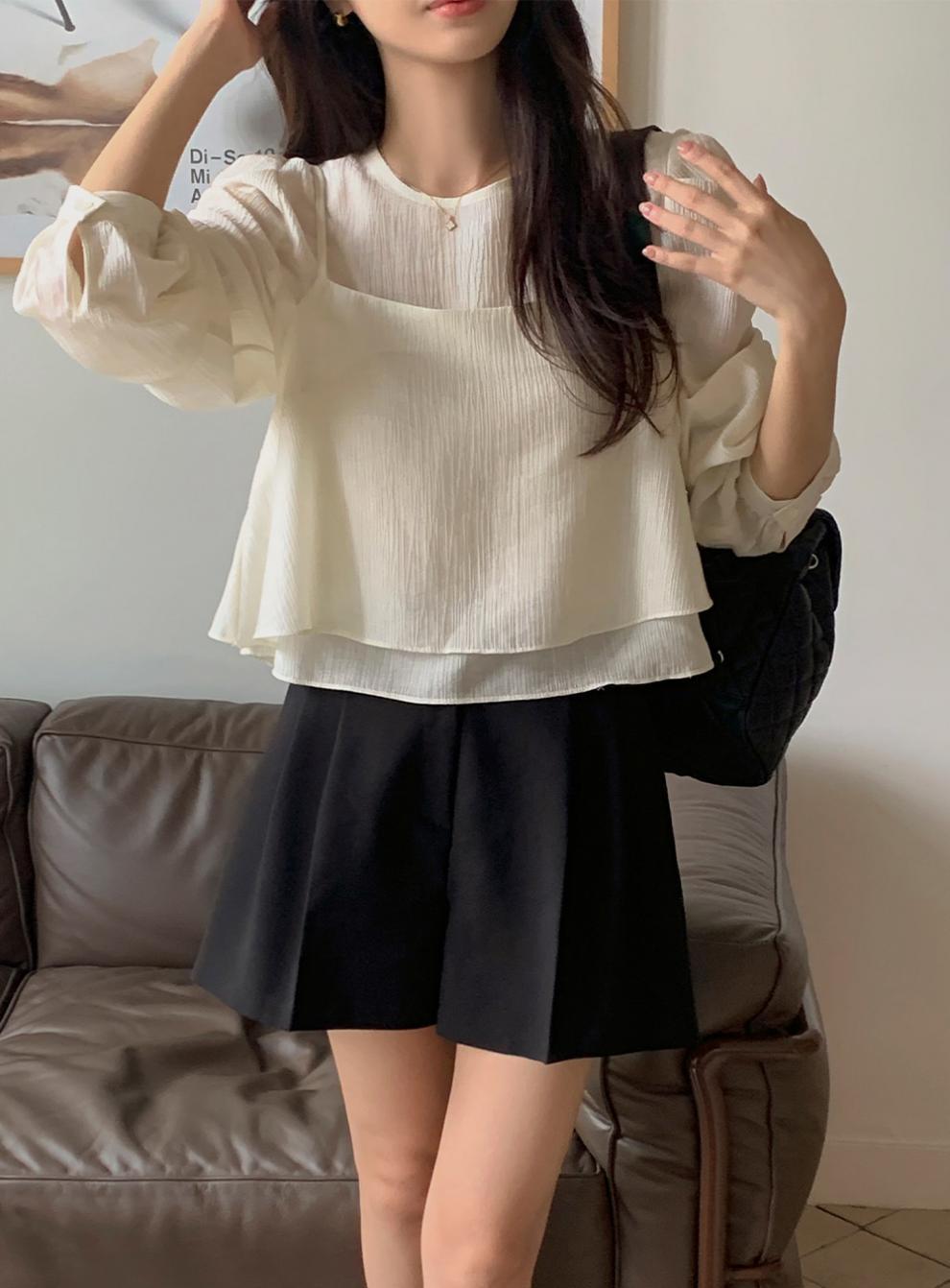 프랑스 시폰 셔츠 여성용 세련된 틈새 디자인 관점 작은 셔츠 스트랩 조끼 독특한 긴 소매 셔츠 투피스 세트스토어 가기