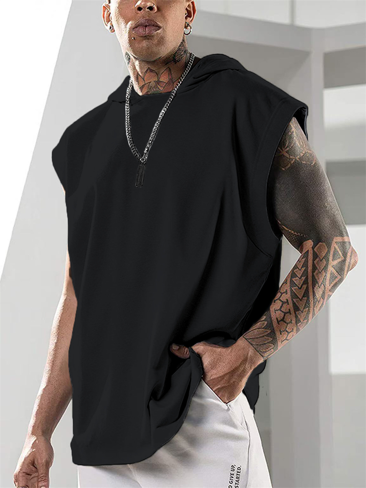 2025 년 여름 국경 간 대외 무역 뜨거운 남자 하이 퀄리티 미국 민소매 느슨한 피트니스 후드 스포츠 조끼스토어 가기
