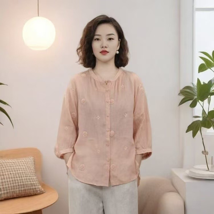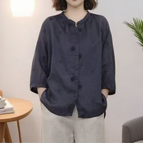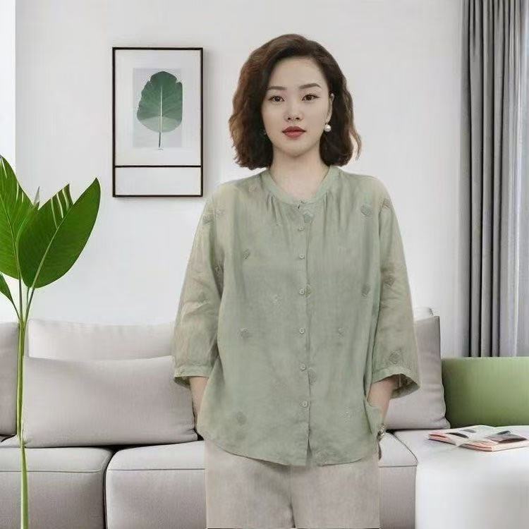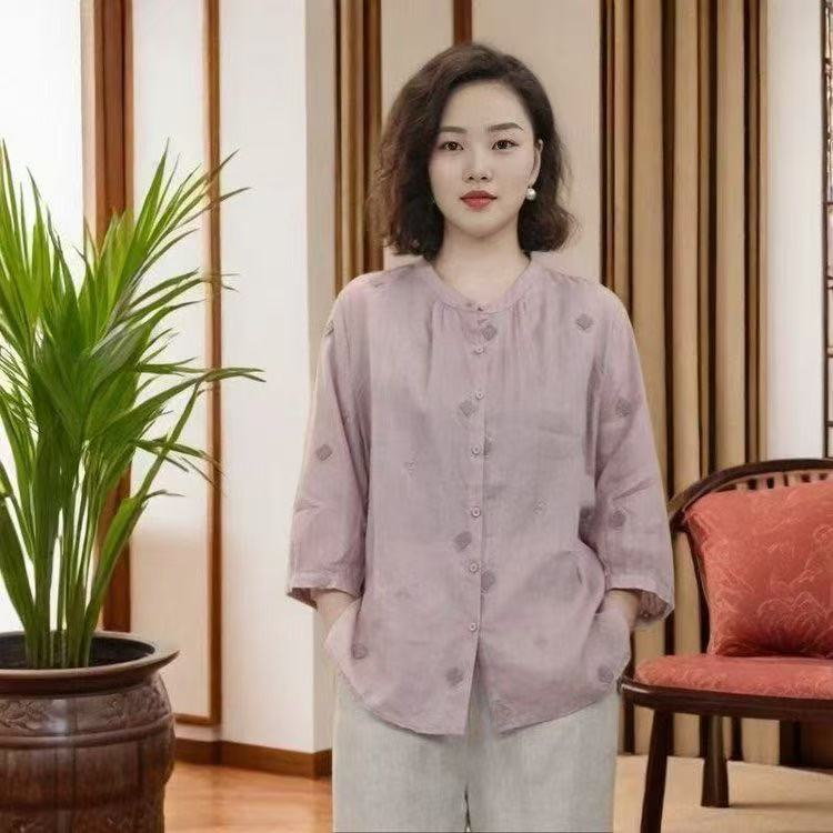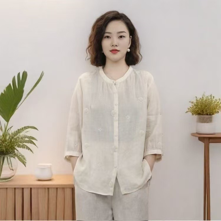 2025 년 새로운 예술적 민족 스타일 복고풍 시대를 줄이는 솔리드 컬러 자수 카디건 7 소매 셔츠