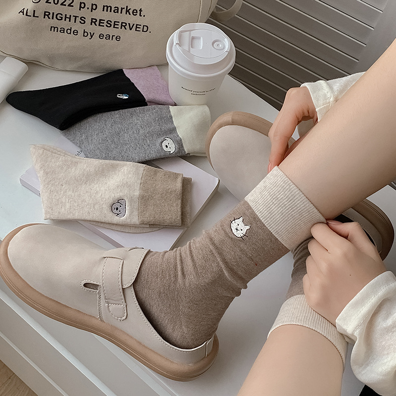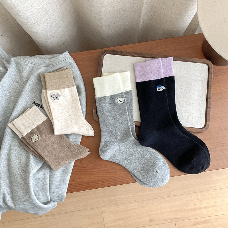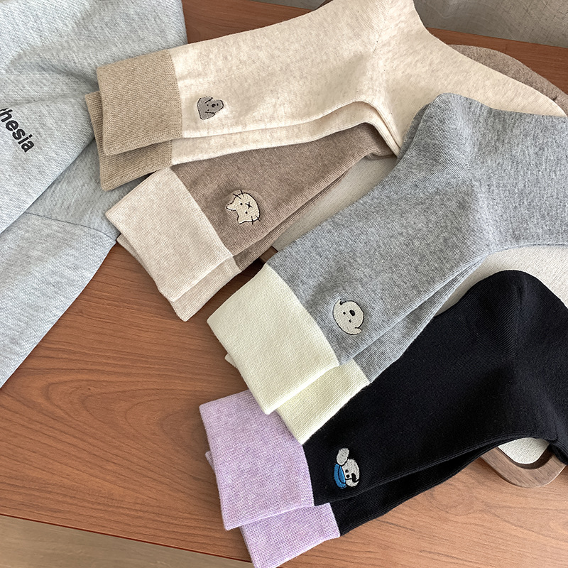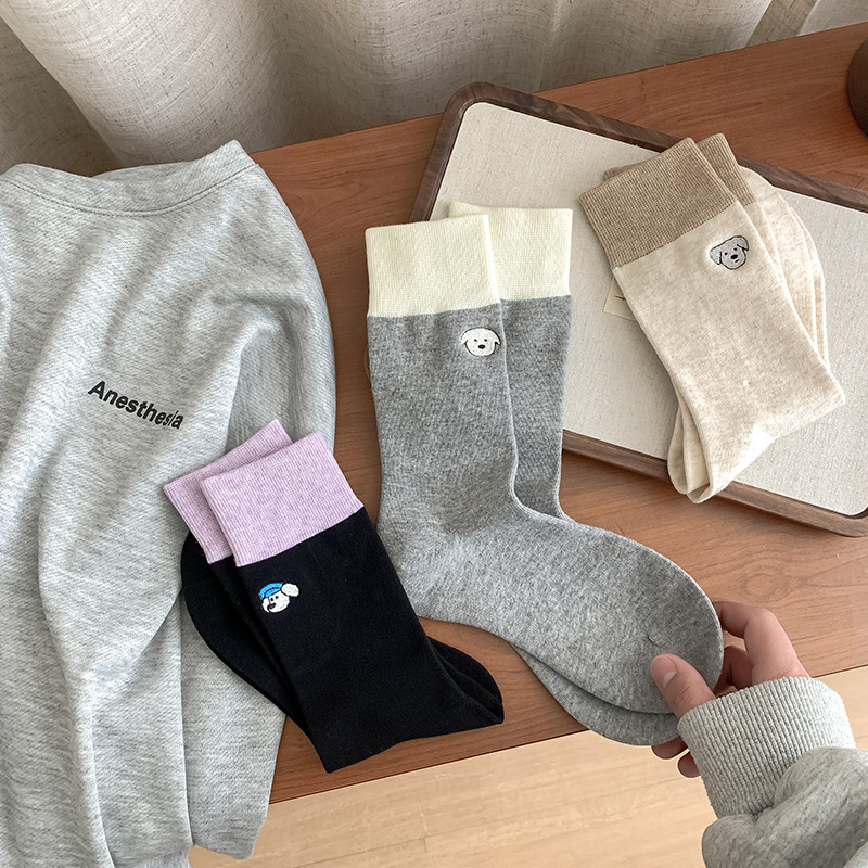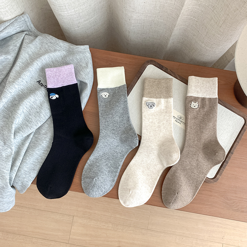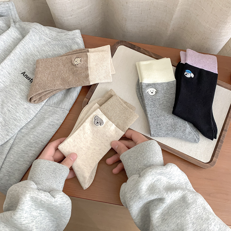 봄과 여름 새로운 한국 자수 만화 강아지 양말 여성 대학 스타일 대비 중간 크기의 양말 흑백 회색