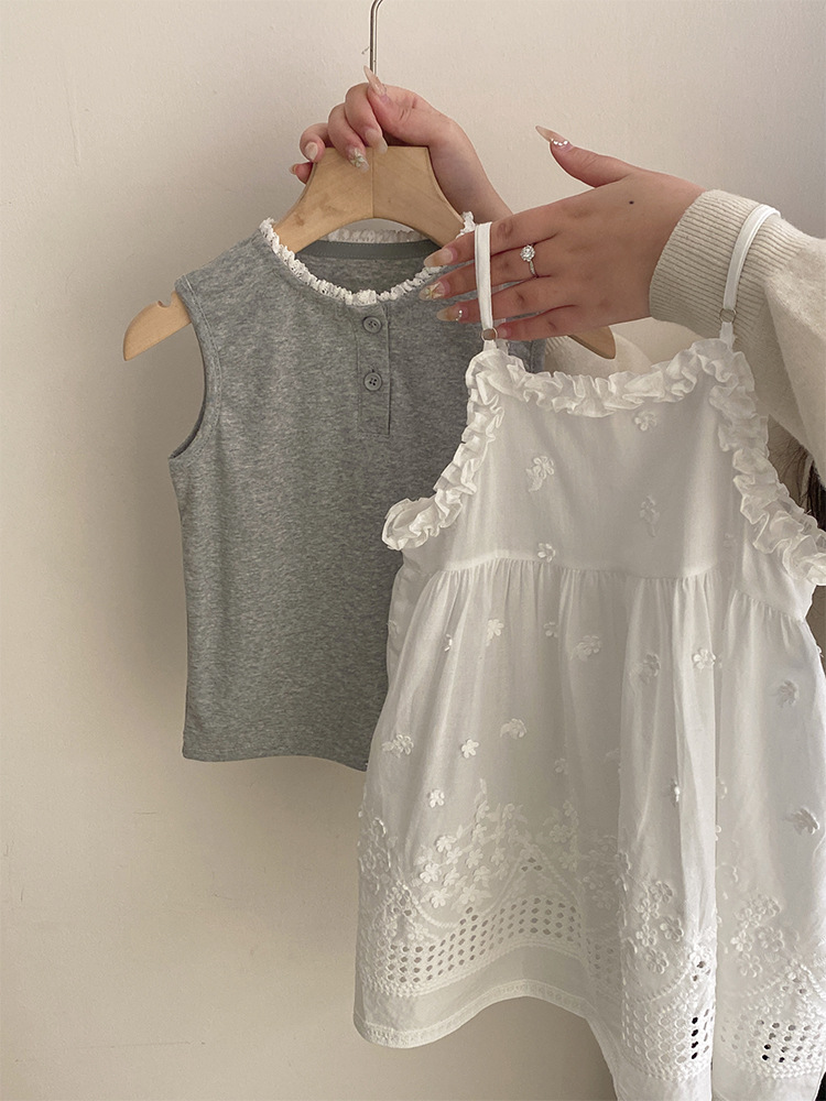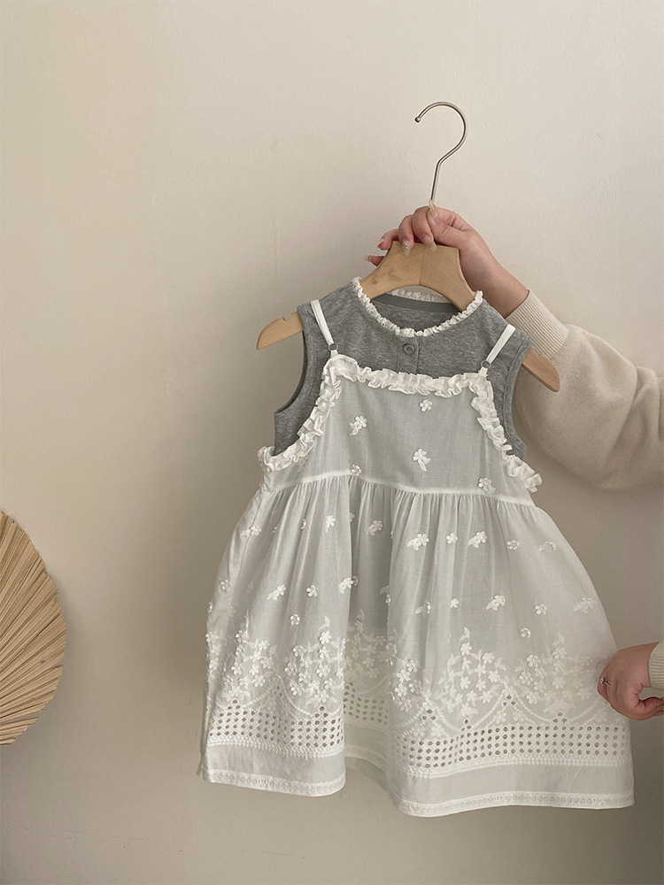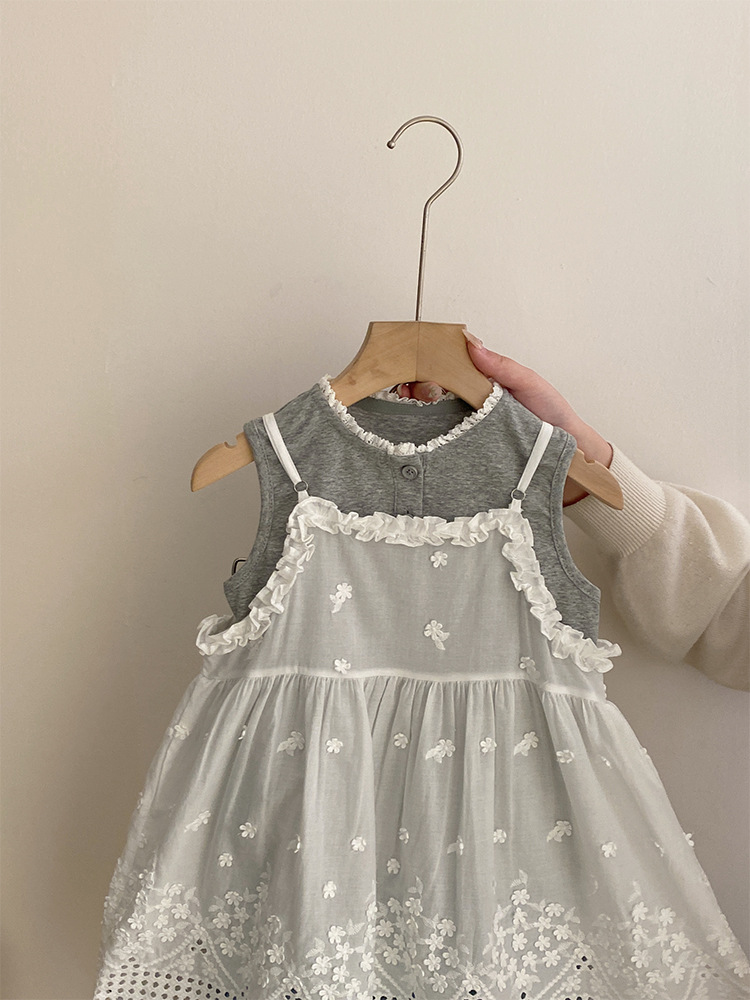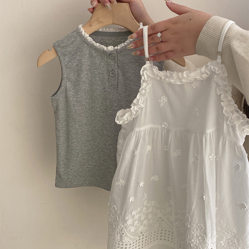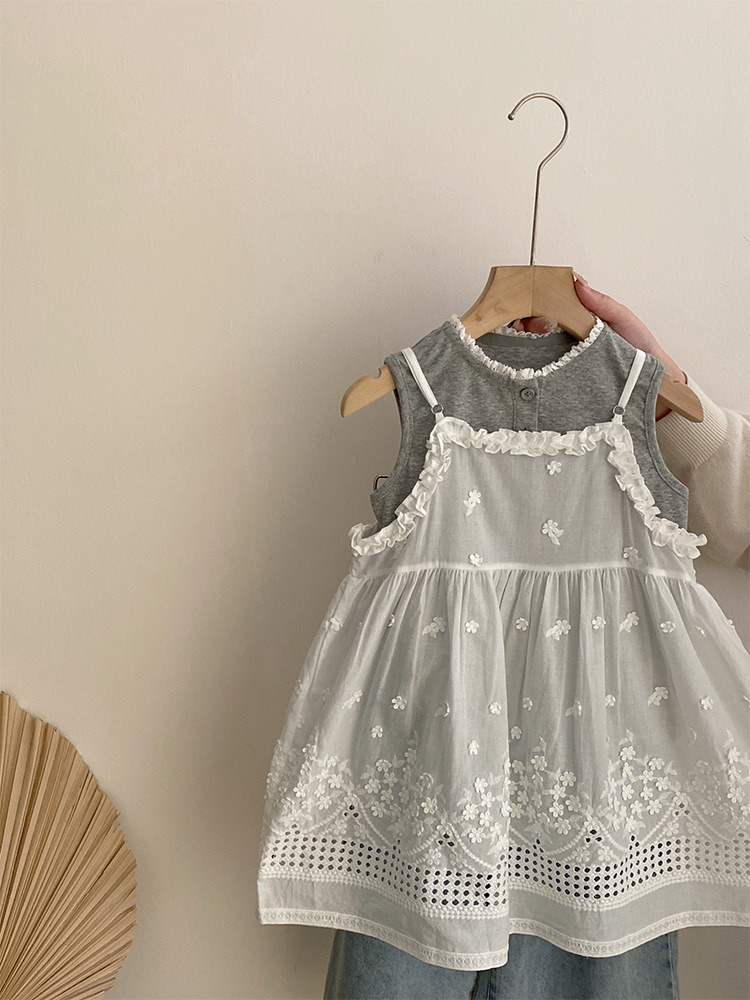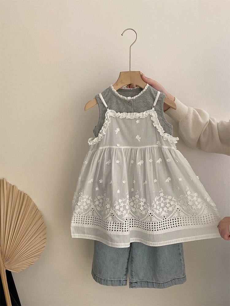 여아 2025 년 여름 새 한국식 레이스 조끼 어린이 자수 레이스 슬링 원피스 느슨한 청바지