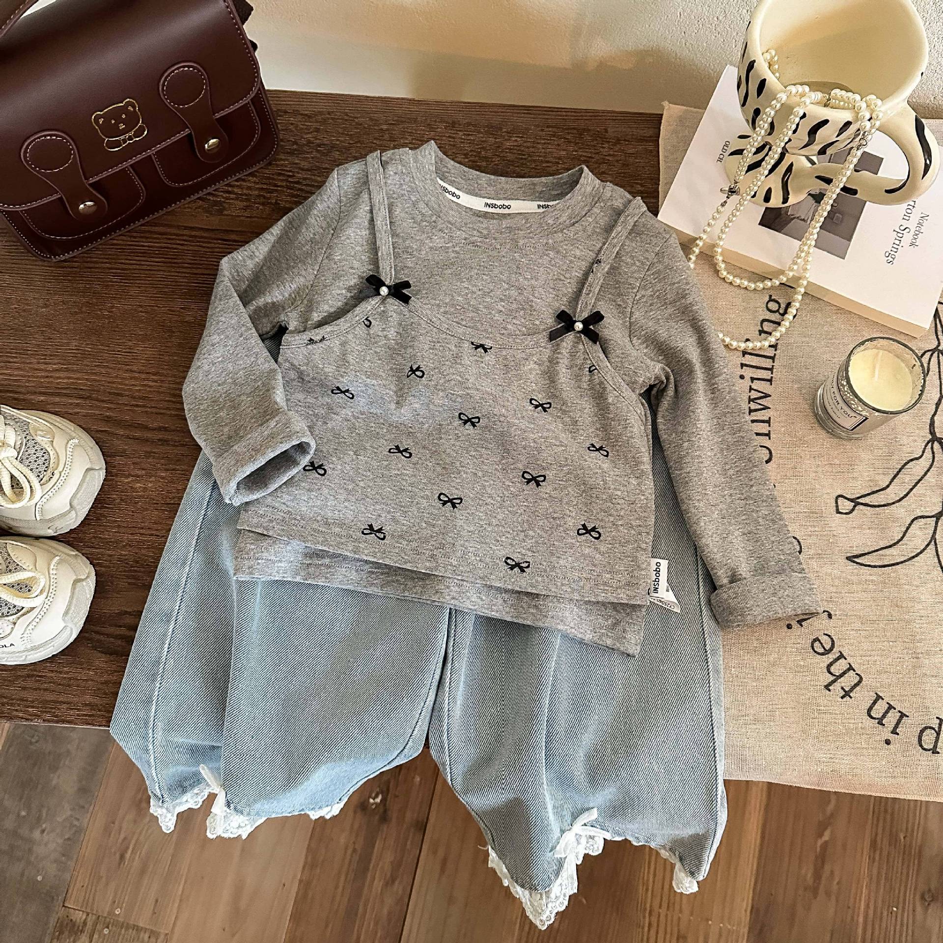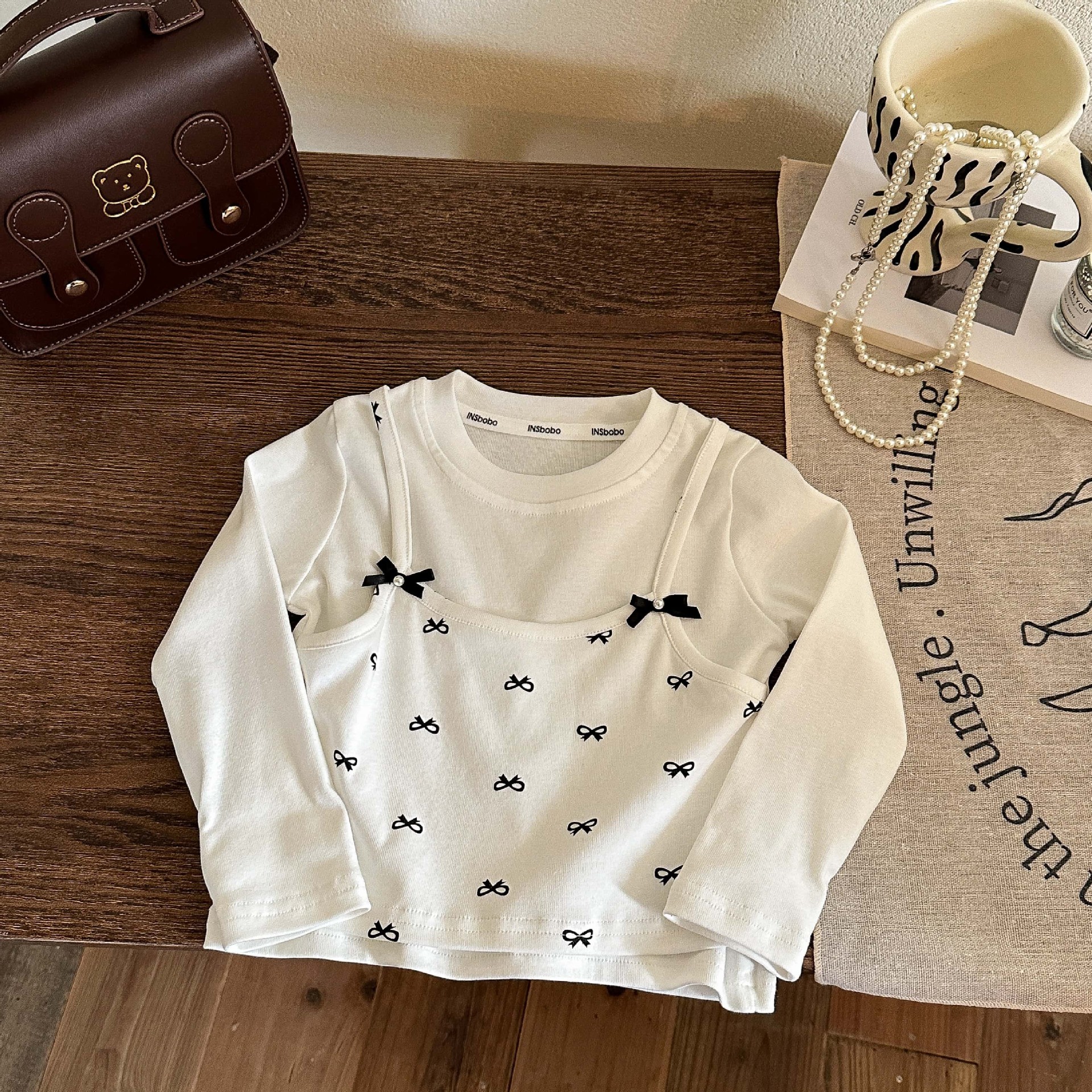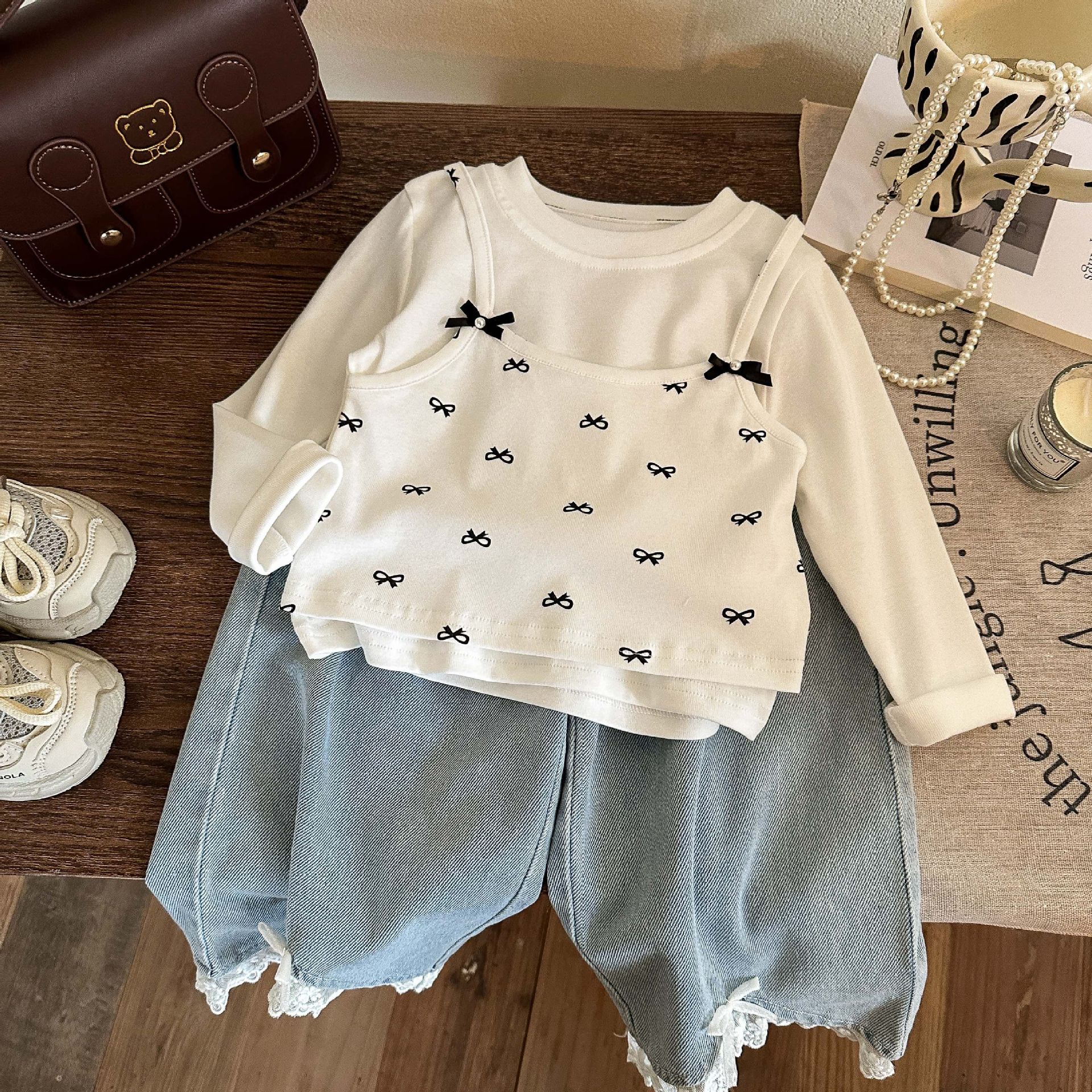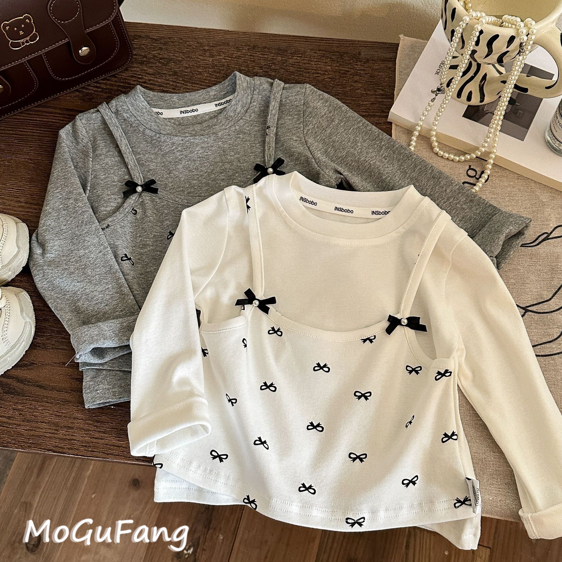 소녀들의 봄 새로운 도착 목회베이스 셔츠 가짜 투피스 솔리드 컬러 올 매치 보우 스티칭베이스 레이스 탑 트렌디스토어 가기