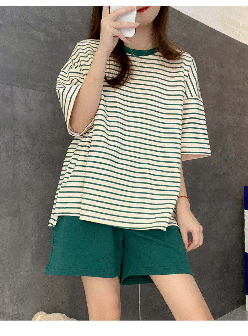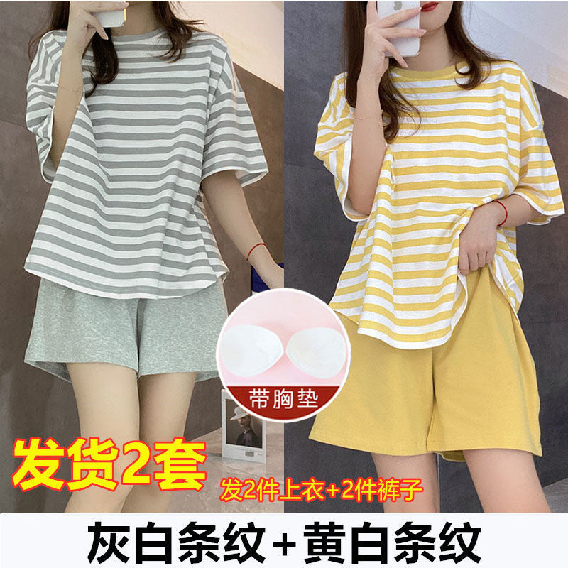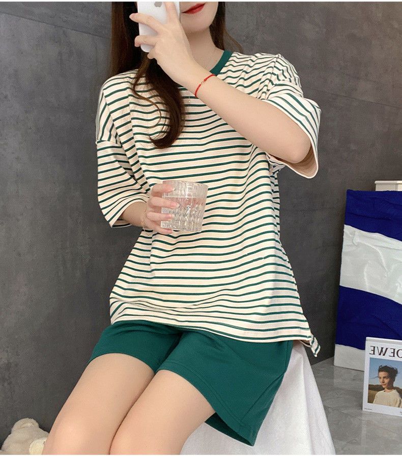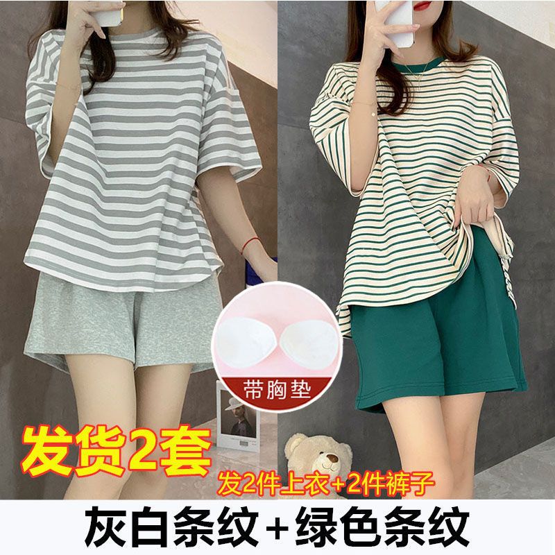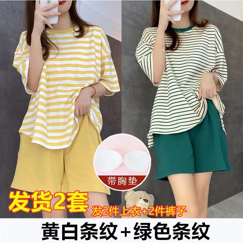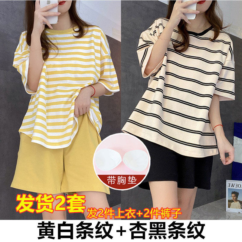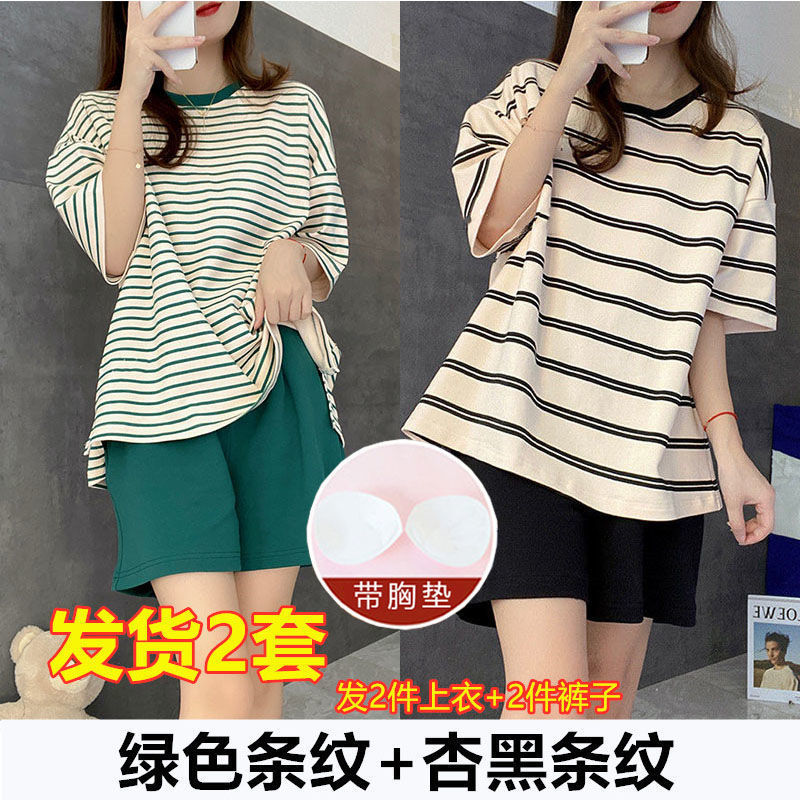 5XL 크기 느슨한 패드 잠옷 여성 여름 반팔 줄무늬 학생 캐주얼 여름 홈 의류 세트스토어 가기