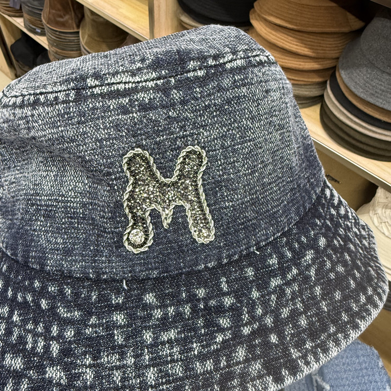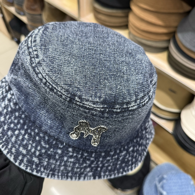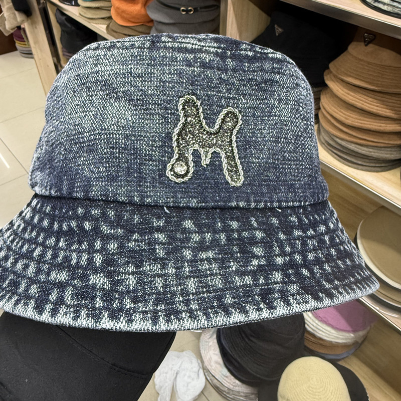 潮牌重工水钻M字母水洗牛仔渔夫帽子女春夏遮阳显瘦休闲盆帽百搭