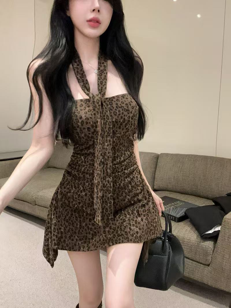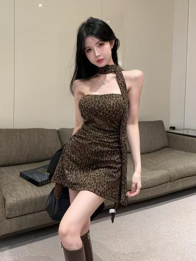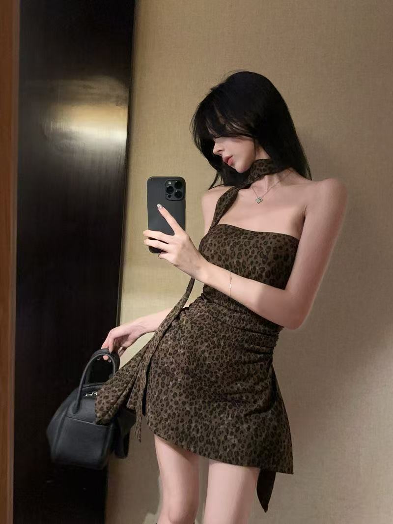 홍콩 스타일 핫 걸 스타일 목에 매달린 레오파드 무늬 스윙 칼라 원피스 불규칙한 슬림 핏 러플 슬림 디자인 센스 빅 원피스스토어 가기