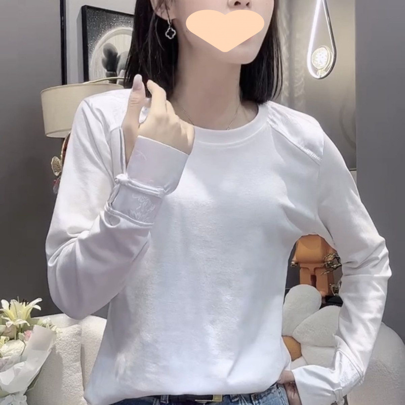 중국 스타일 스티칭 화이트 셔츠 긴팔 올 매치 웨스턴 스타일 우아한 틈새 슬리밍 라운드 넥 버클 민족 스타일 탑스토어 가기
