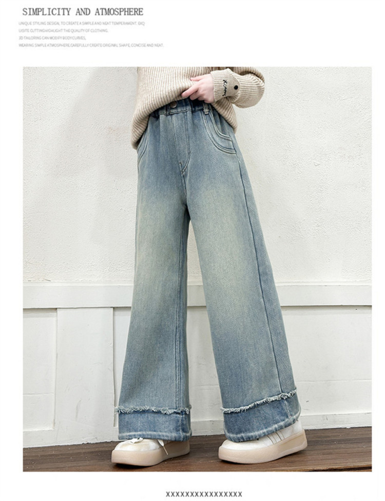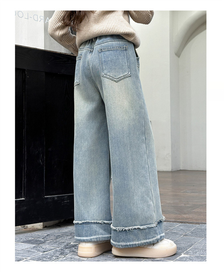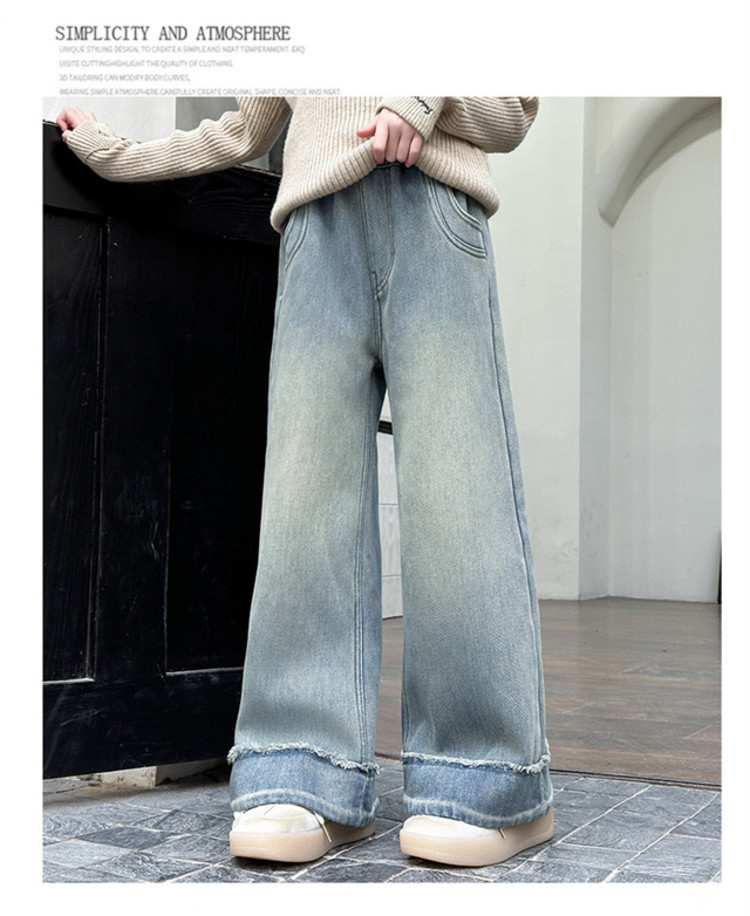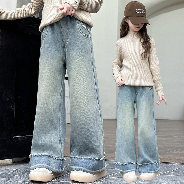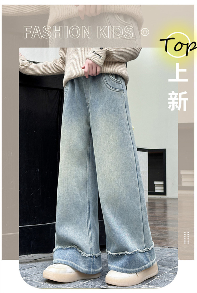 봄과 가을 새로운 소녀 바지 2025 느슨한 직선 청바지 어린이 유행 서양식 폭발 단순스토어 가기