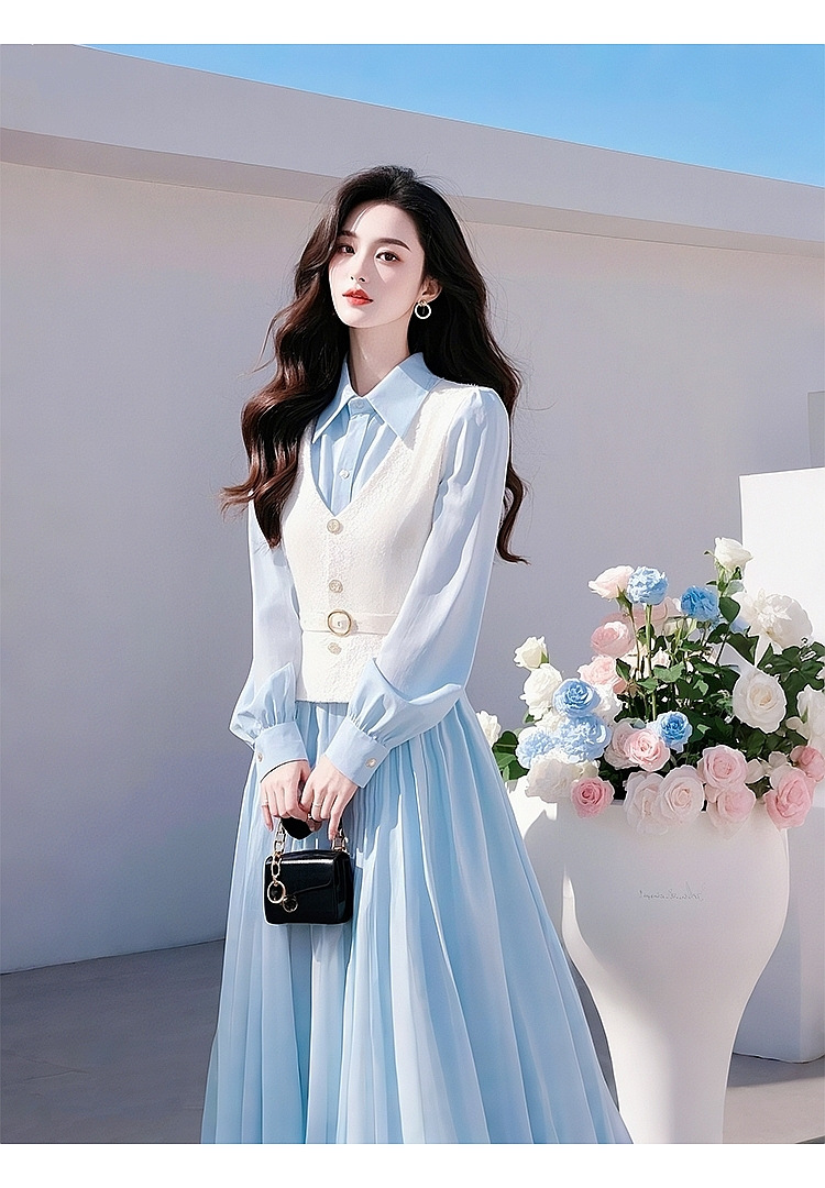 2025년 여성복 세트, 나이를 줄여주는 패셔너블한 연한 파란색 셔츠 원피스, 조끼, 비즈니스 정장, 여성 캐주얼스토어 가기