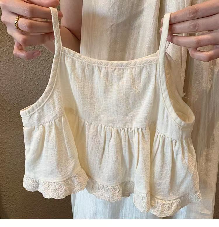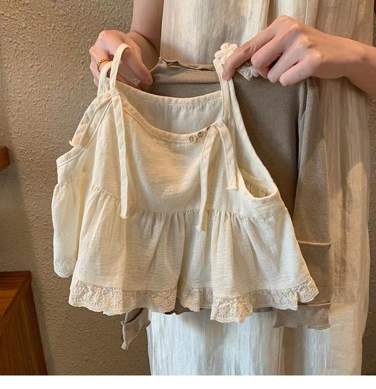 • 살구 멜빵 + 카키색 밑단 셔츠