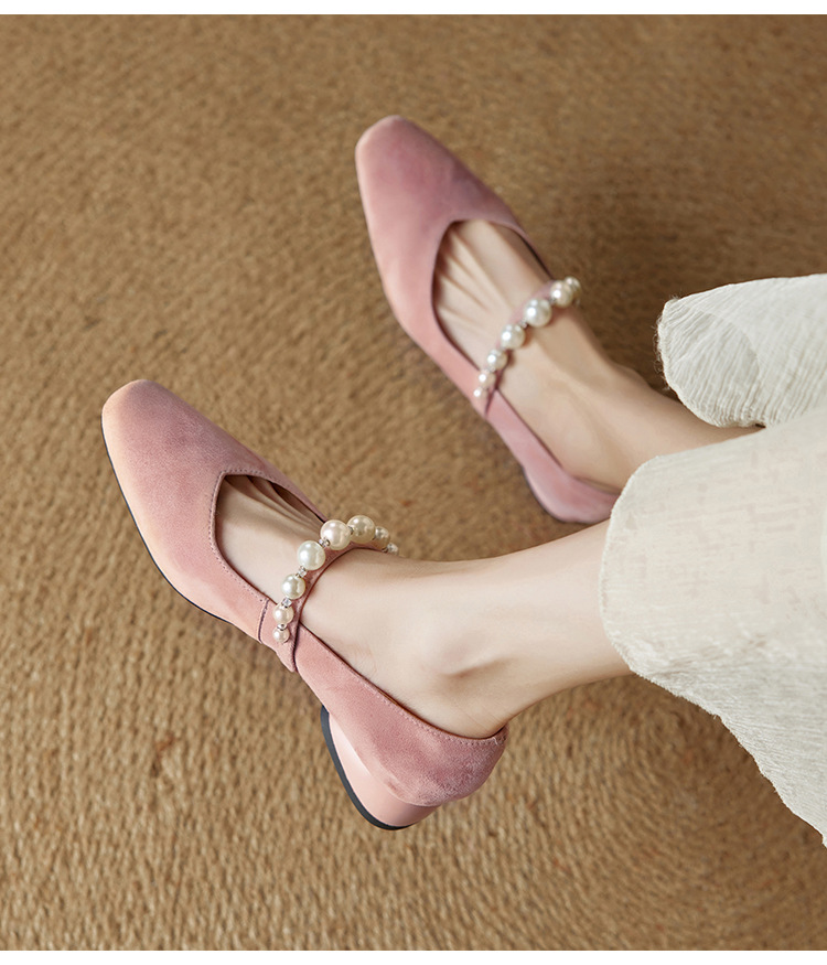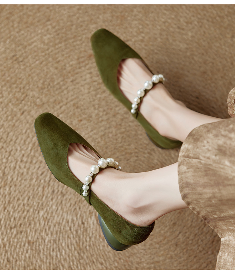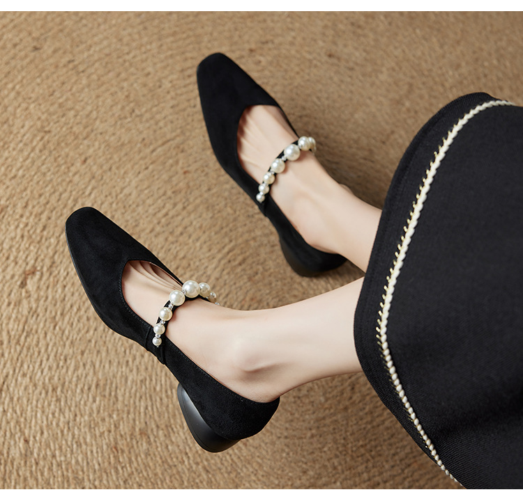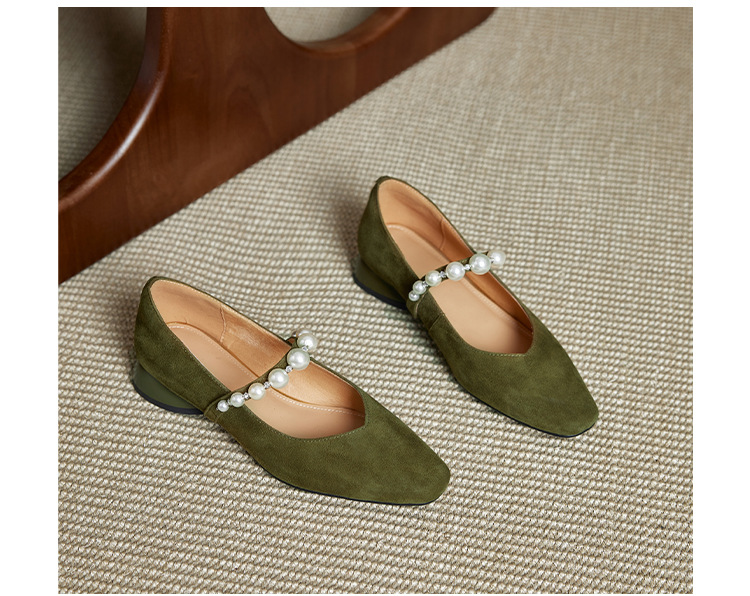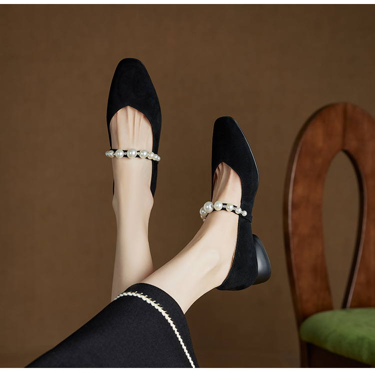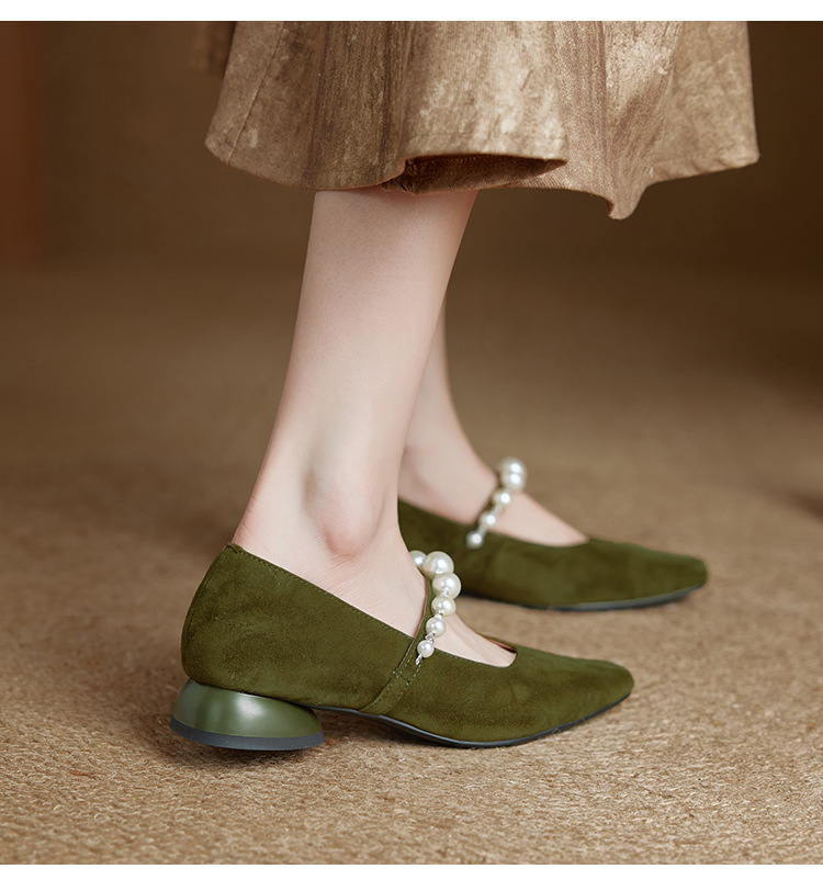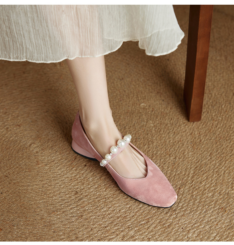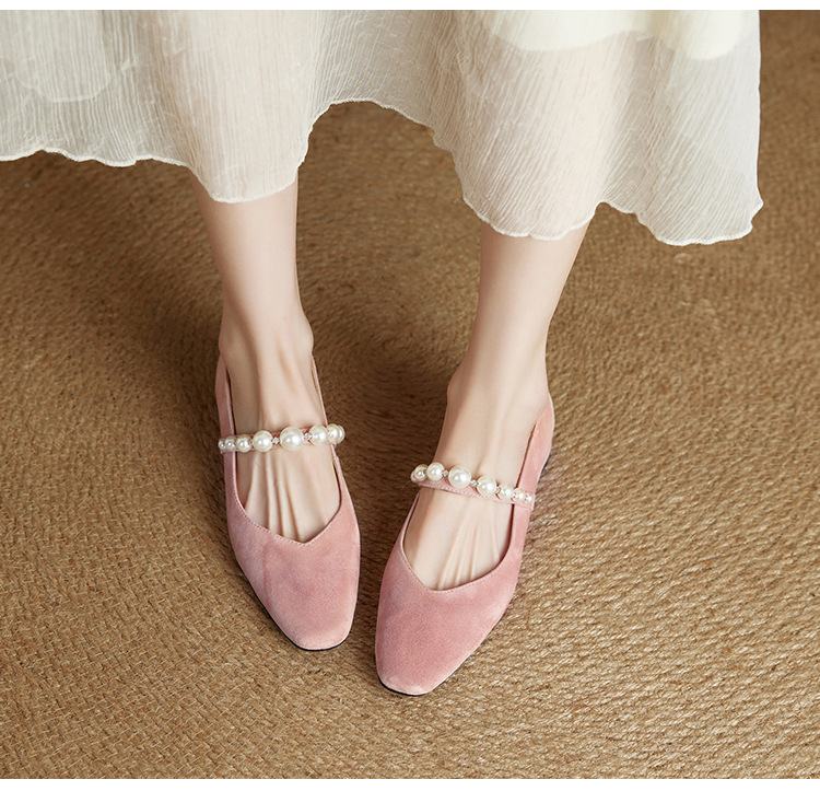 프렌치 스타일 스퀘어 토 펄 싱글 레이어 슈즈 로우 힐 여성용 봄과 가을 레트로 우아한 플랫 힐 프로스트 셔스 입 메리 제인 신발