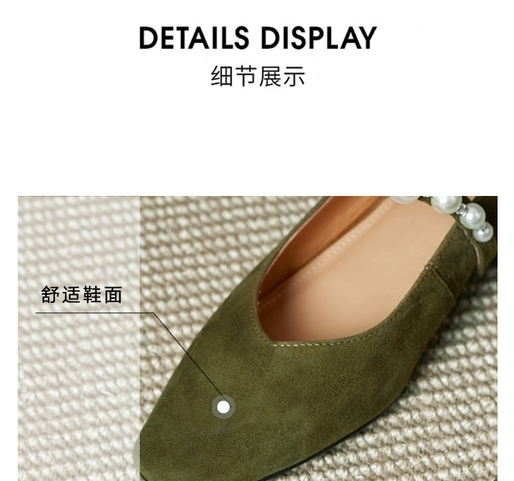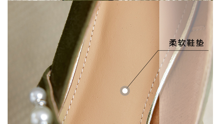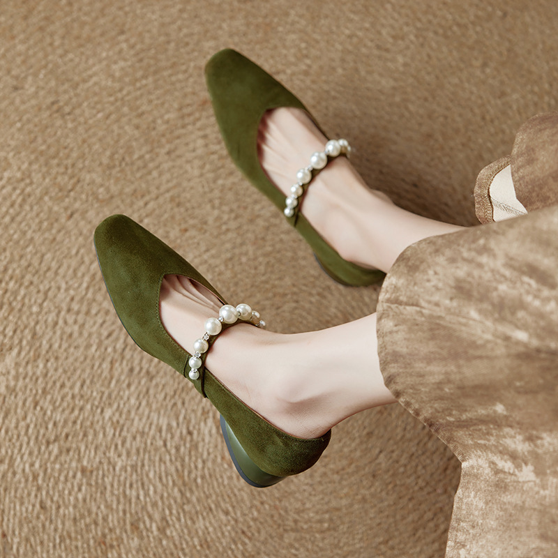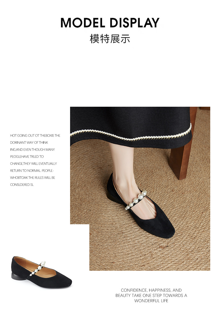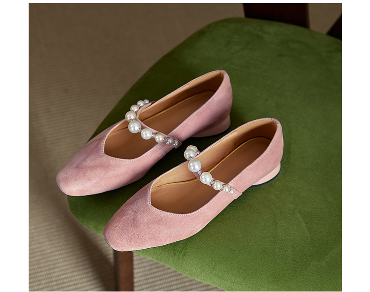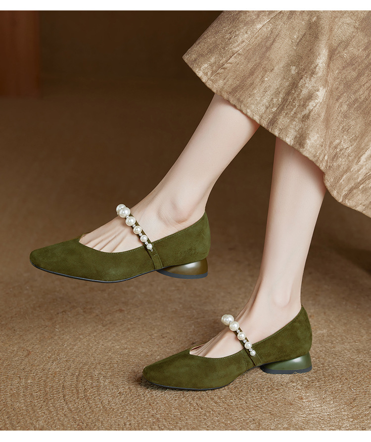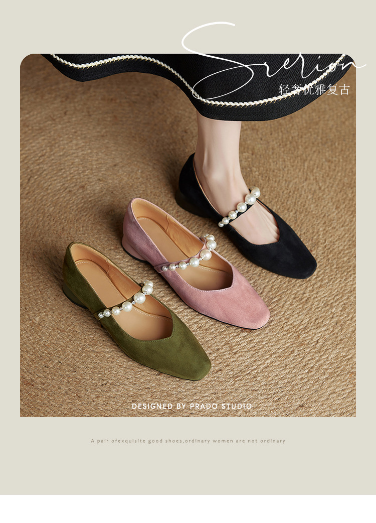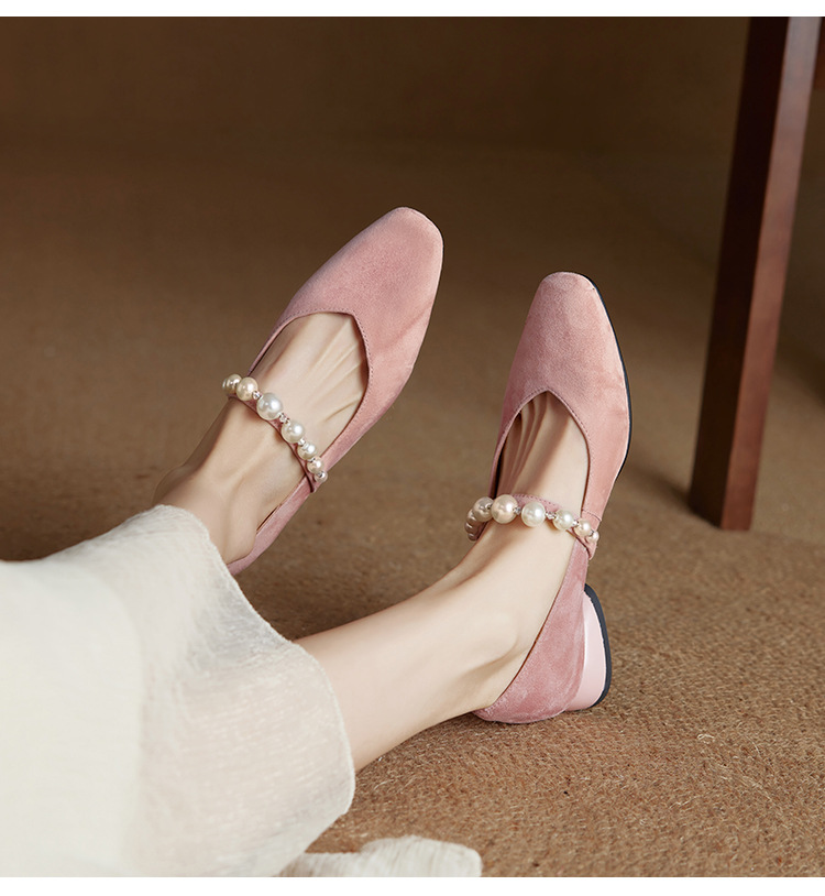프렌치 스타일 스퀘어 토 펄 싱글 레이어 슈즈 로우 힐 여성용 봄과 가을 레트로 우아한 플랫 힐 프로스트 셔스 입 메리 제인 신발