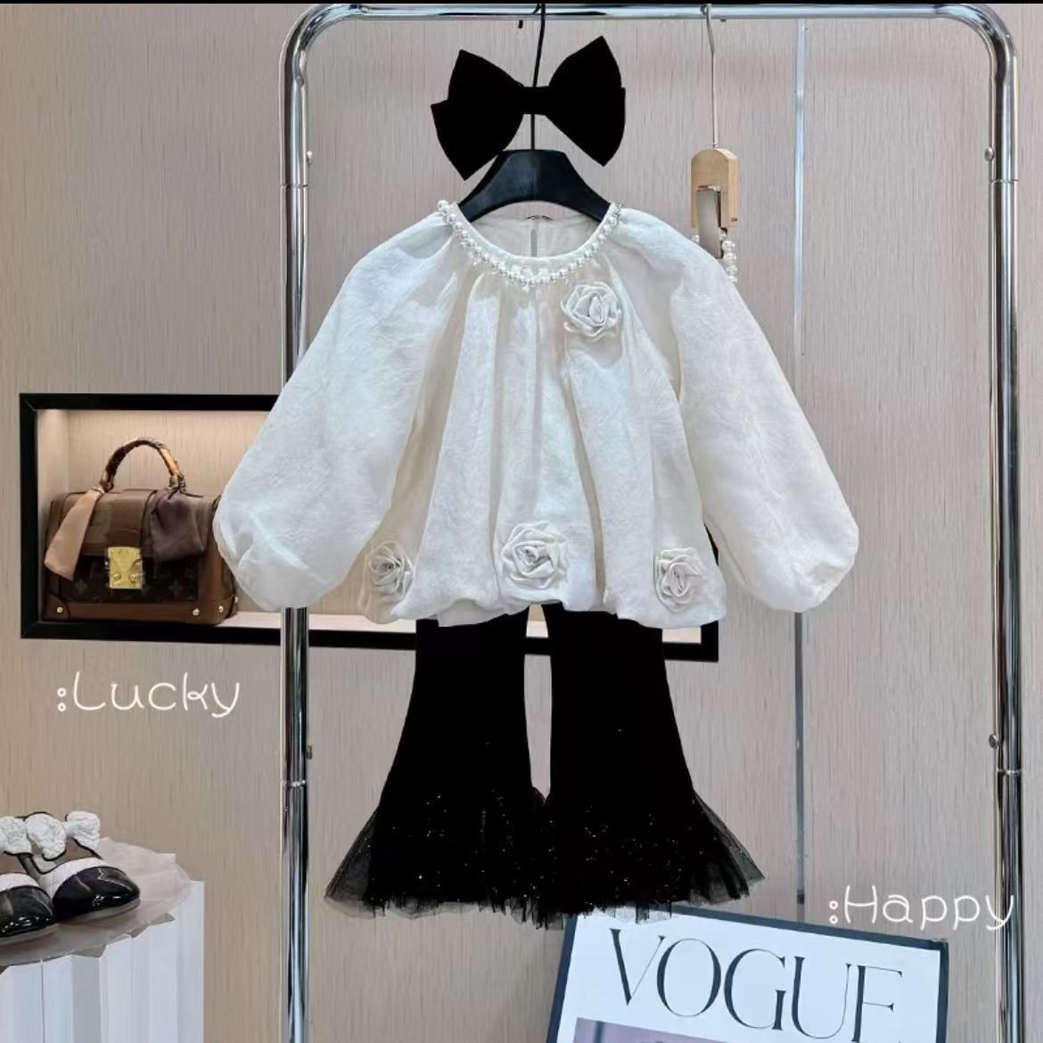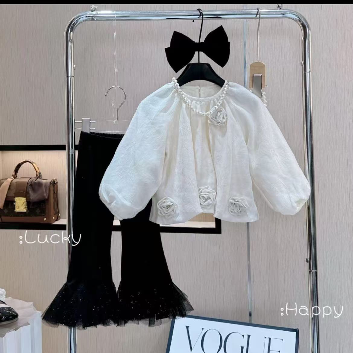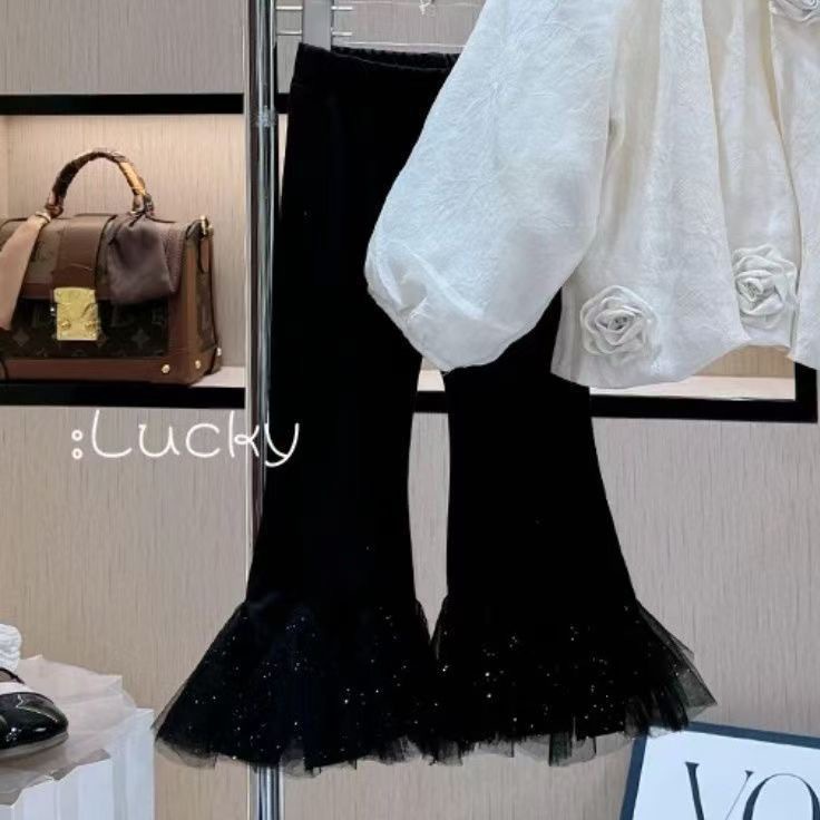 소녀의 봄 원피스 세트 2025 새로운 긴 소매 서양식 소녀 패션 마이크로 플레어 바지 아기 소녀의 봄 원피스