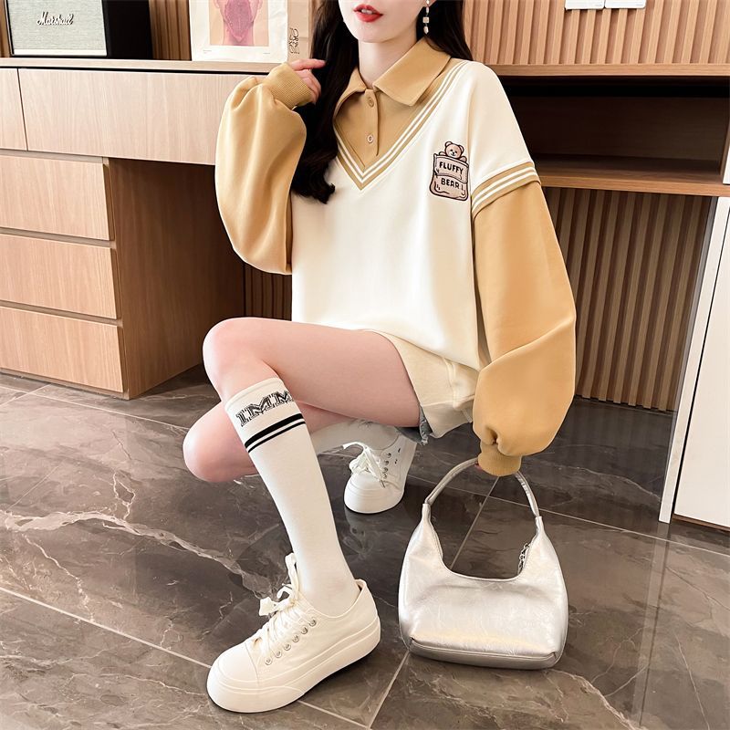 이른 봄 가짜 투피스 폴로 셔츠 스웨터 여성의 봄과 가을 2025 새로운 느슨한 중학교 학생 작은 옷깃 탑스토어 가기