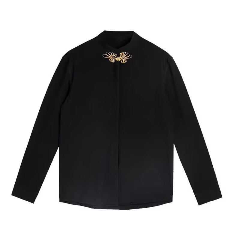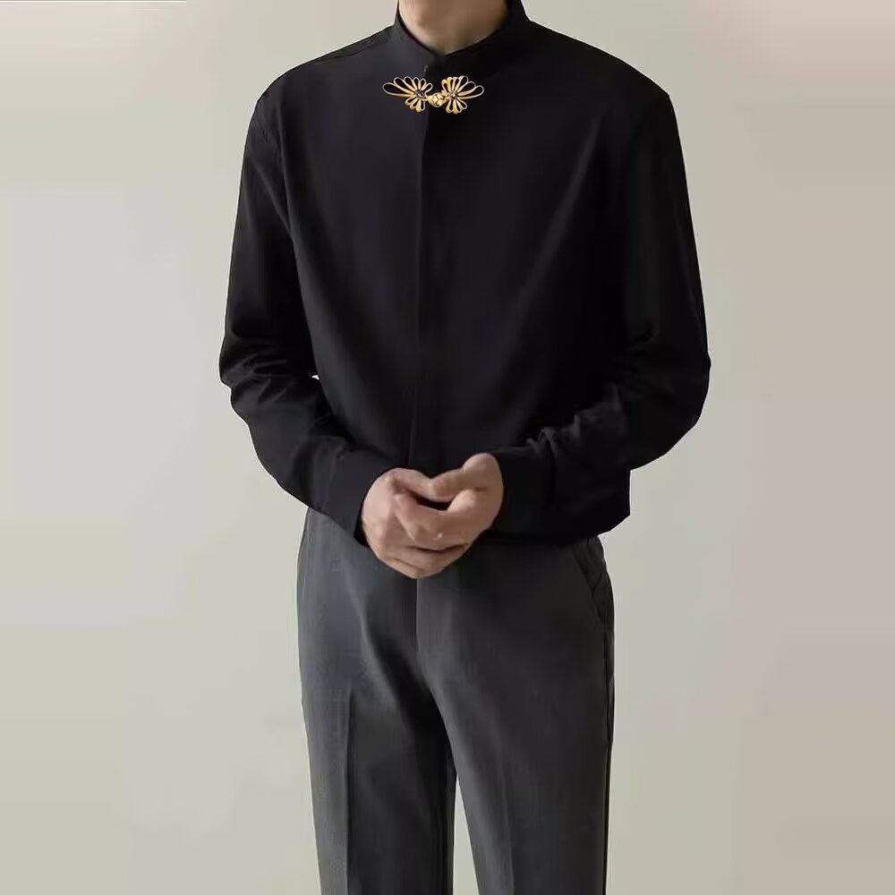 새로운 중국 스타일 가벼운 성숙한 스타일 셔츠 남자의 신랑 결혼식 등록 원피스 약혼 인테리어 블랙 라이닝 칼라 긴 소매 셔츠