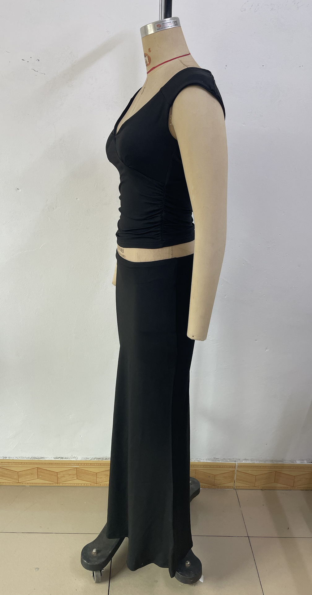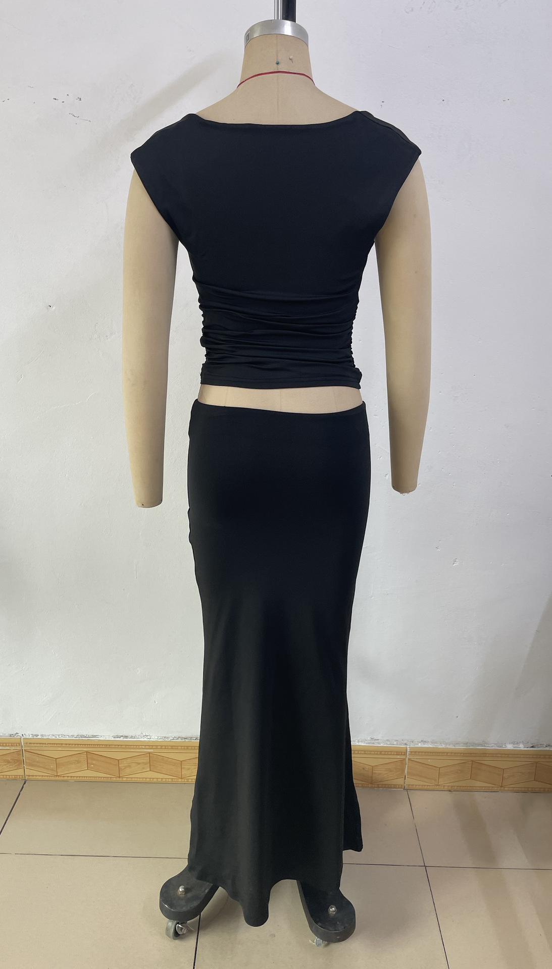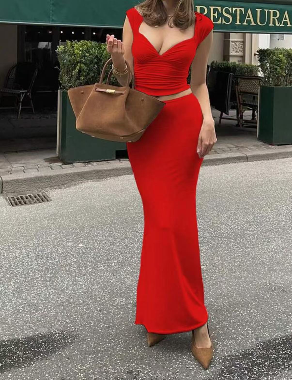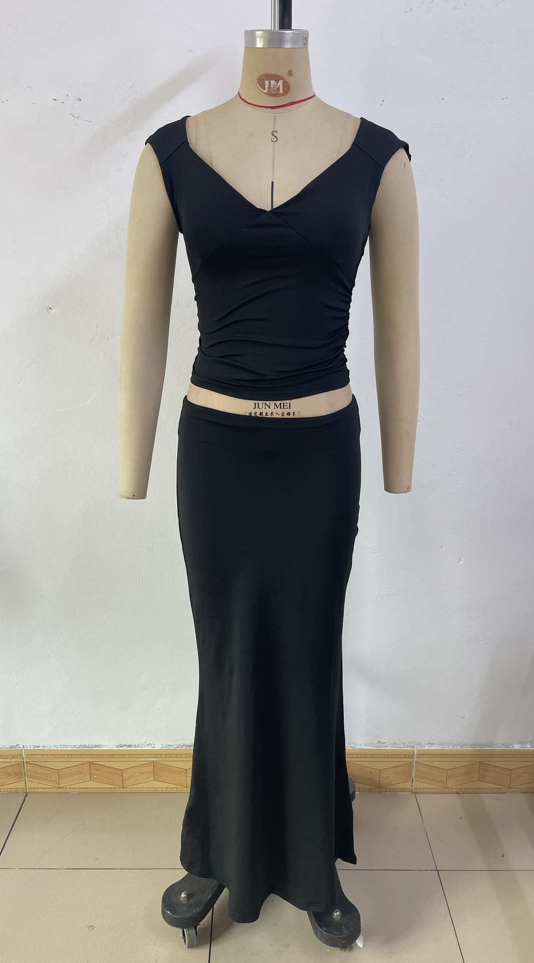 AYJ25T219--2025 여성용 피쉬테일 스커트 세트, 슬림핏 딥 브이넥 플리츠 반팔 탑, 허리 노출 디자인