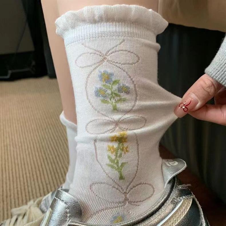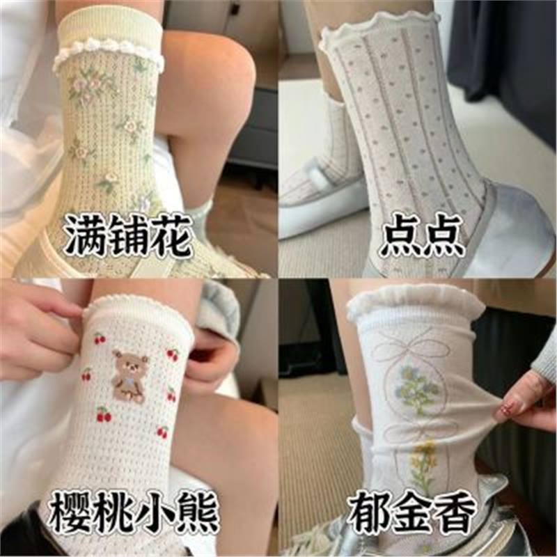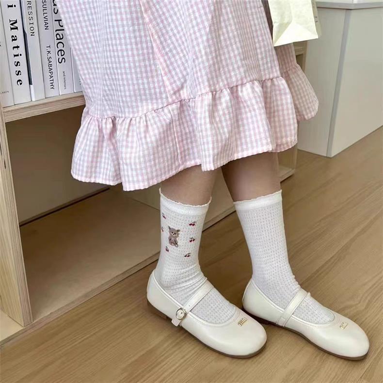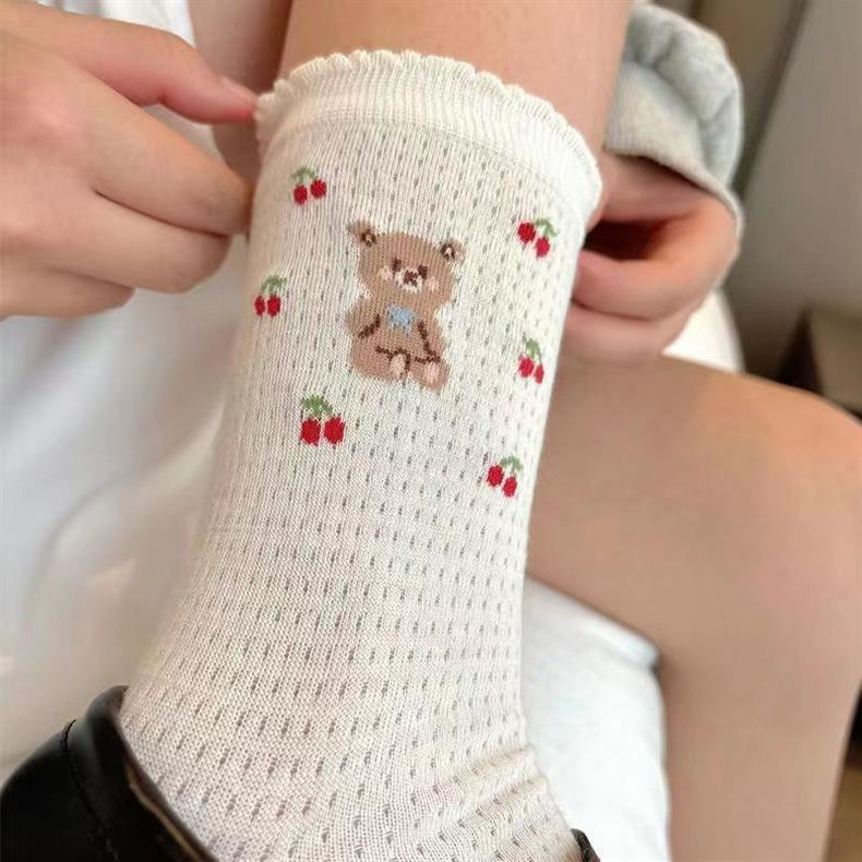 메쉬 양말 여성용 미드 튜브 양말 순수 코튼 여름 얇은 체리 베어 레이스 작은 가죽 신발 포장 미끄럼 방지 양말스토어 가기