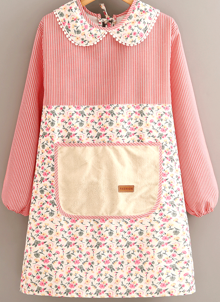 • 긴팔 캔버스 스몰 라운드넥 세로줄무늬 손주머니(핑크) + 앞치마✓