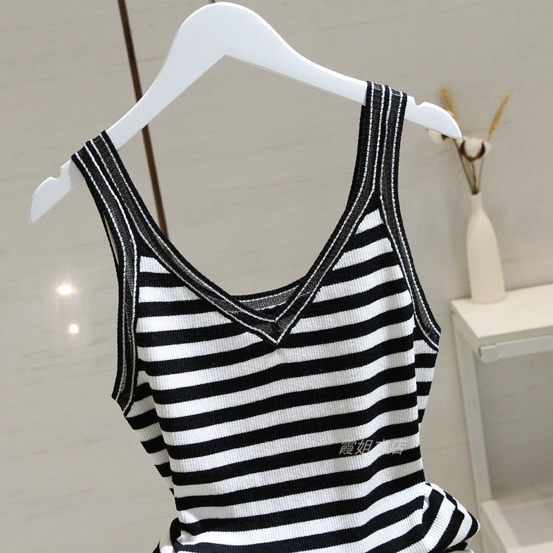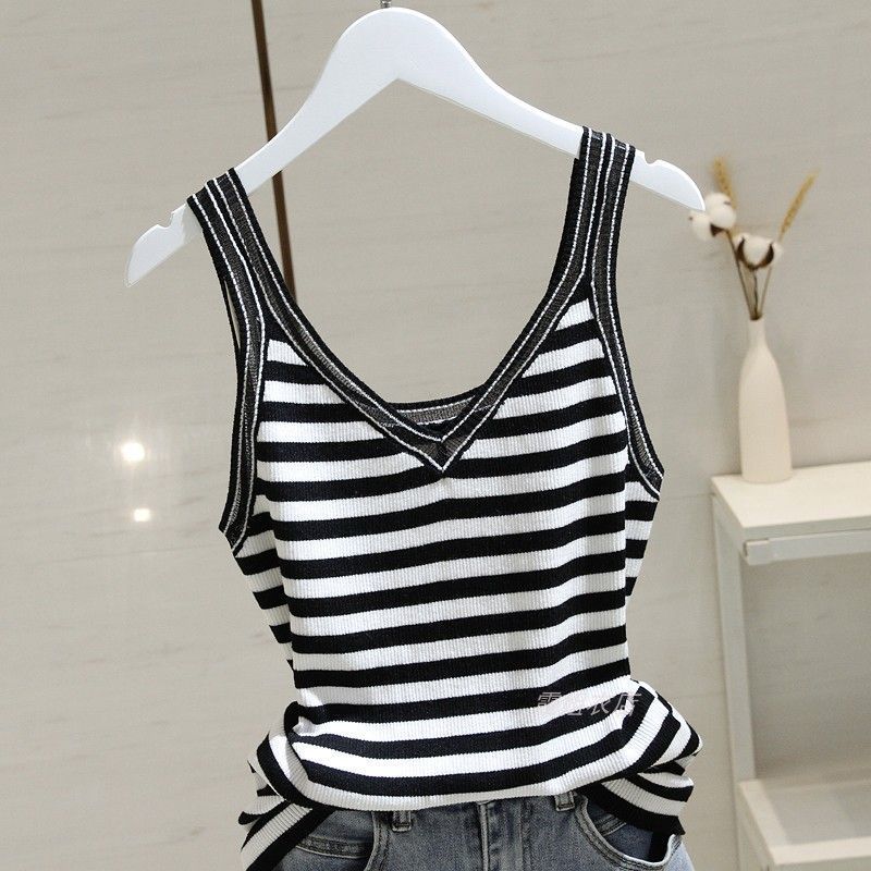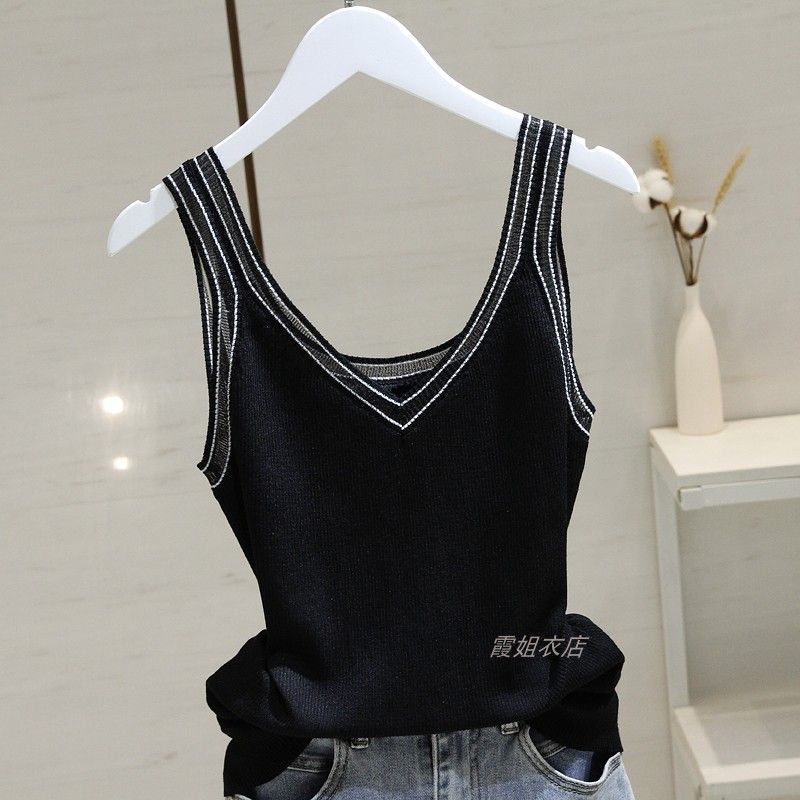 아이스 실크 V-넥 니트 조끼 슬링 여성 2025 년 여름 새로운 스타일 메쉬 스티칭 디자인 센스 틈새 내부 탑스토어 가기