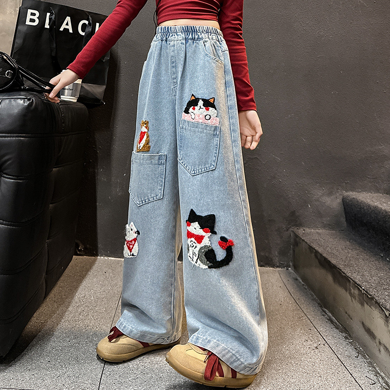 소녀 바지 2025 봄 새로운 키티 청바지 큰 어린이 봄과 가을 느슨한 넓은 다리 바지 소녀 스트레이트 다리 바지스토어 가기