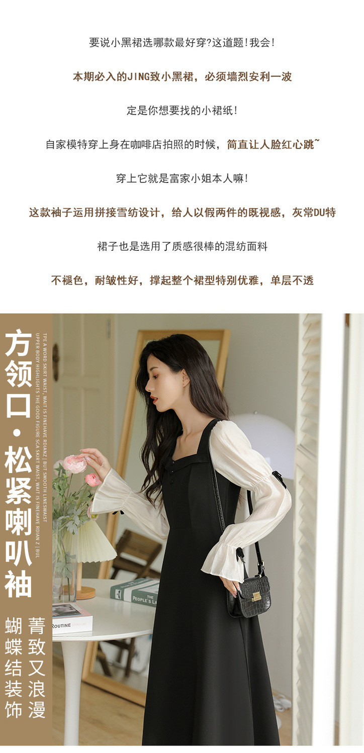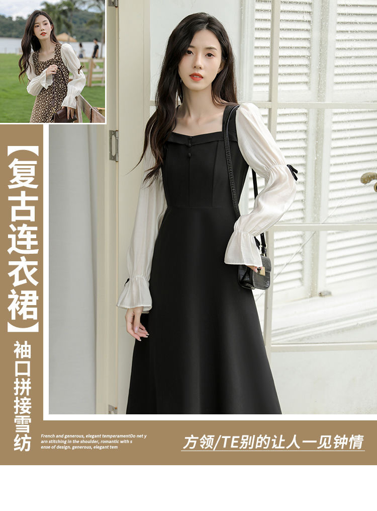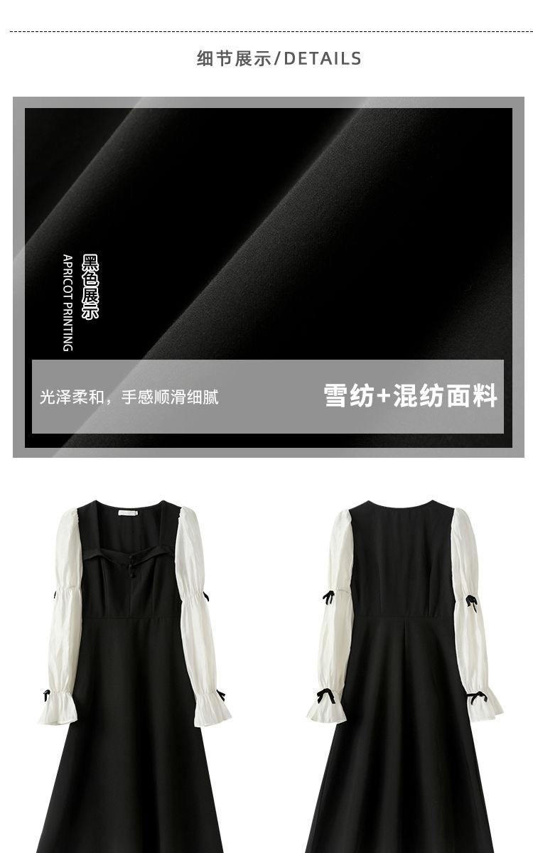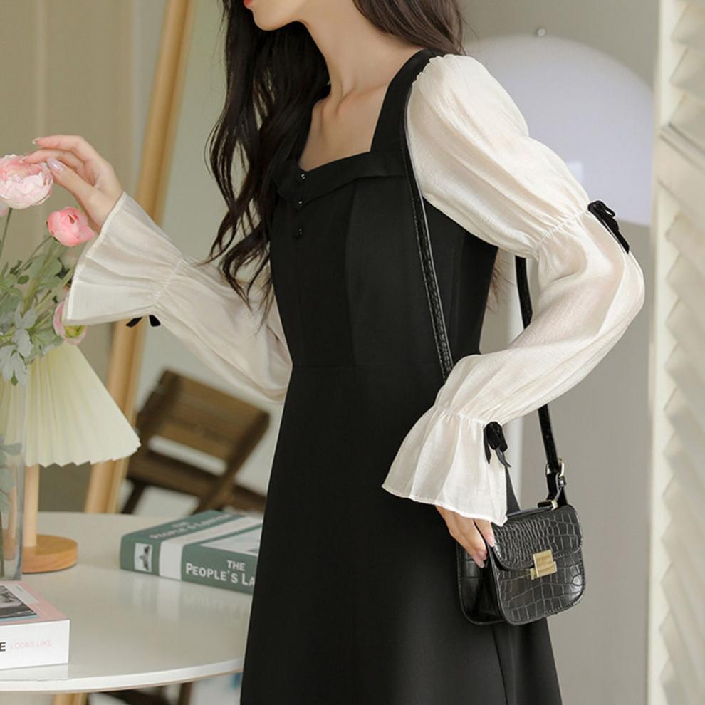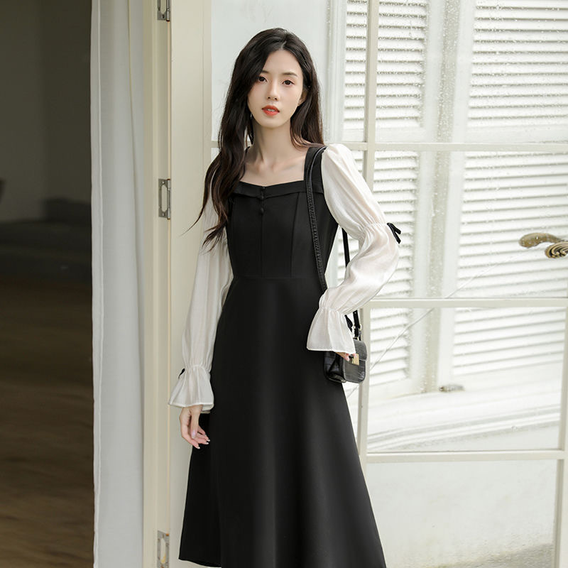 프랑스 우아한 긴 소매 대비 색상 원피스 2025 가을 새로운 허리 슬리밍 우아한 검은 원피스 긴 치마스토어 가기
